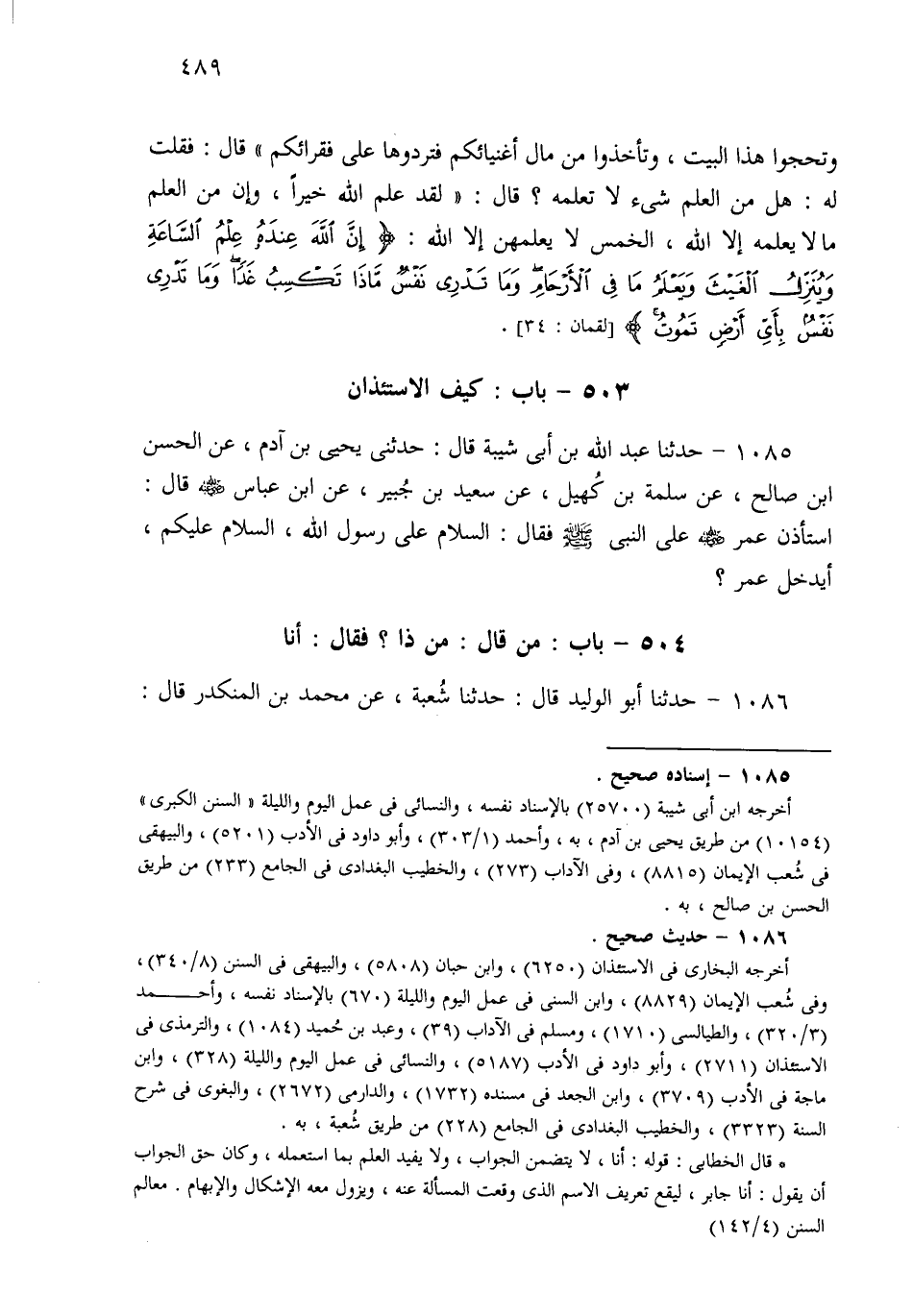 1085- حَدثنا عَبْدُ اللهِ بْنُ أَبِي شَيْبَةَ قَالَ: حَدَّثَنِي يَحْيَى بْنُ آدَمَ، عَنِ الْحَسَنِ بْنِ صَالِحٍ، عَنْ سَلَمَةَ بْنِ كُهَيْلٍ، عَنْ سَعِيدِ بْنِ جُبَيْرٍ، عَنِ ابْنِ عَبَّاسٍ قَالَ: اسْتَأْذَنَ عُمَرُ عَلَى النَّبِيِّ صَلى الله عَلَيهِ وسَلم فَقَالَ: السَّلاَمُ عَلَى رَسُولِ اللهِ، السَّلاَمُ عَلَيْكُمْ، أَيَدْخُلُ عُمَرُ؟.