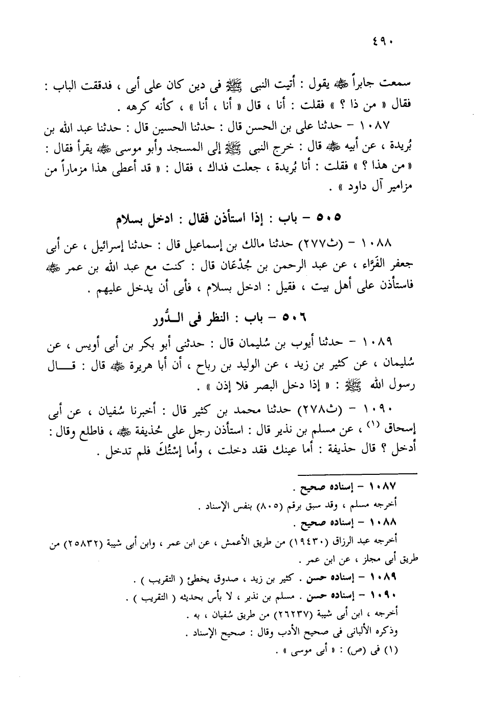 1090م- وَقَالَ رَجُلٌ: أَسْتَأْذِنُ عَلَى أُمِّي؟ قَالَ: إِنْ لَمْ تَسْتَأْذِنْ رَأَيْتَ مَا يَسُوؤُكَ.