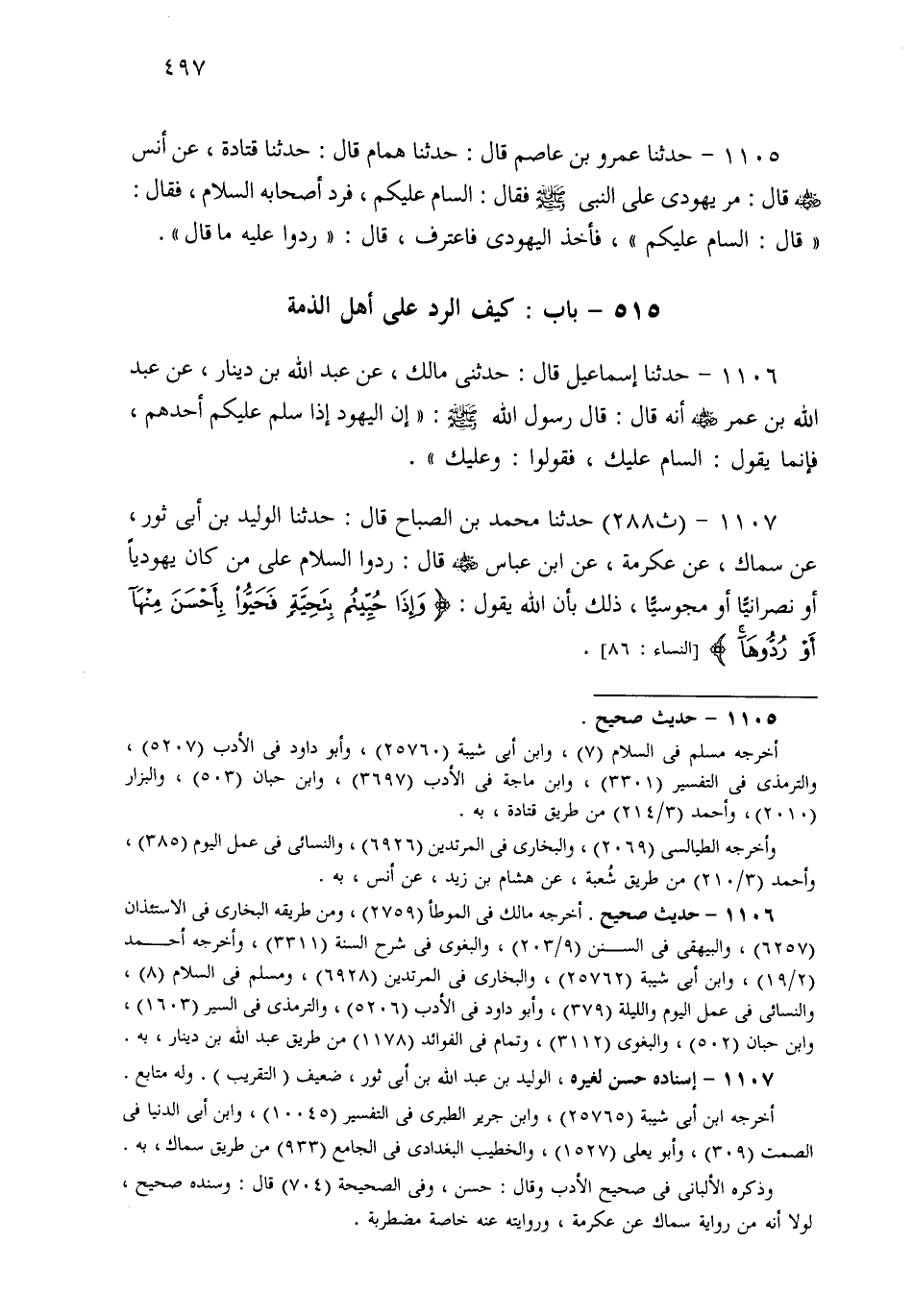 1107- حَدثنا مُحَمَّدُ بْنُ الصَّبَّاحِ، قَالَ: حَدثنا الْوَلِيدُ بْنُ أَبِي ثَوْرٍ، عَنْ سِمَاكٍ، عَنْ عِكْرِمَةَ، عَنِ ابْنِ عَبَّاسٍ قَالَ: رُدُّوا السَّلاَمَ عَلَى مَنْ كَانَ يَهُودِيًّا، أَوْ نَصْرَانِيًّا، أَوْ مَجُوسِيًّا، ذَلِكَ بِأَنَّ اللهَ يَقُولُ: {وَإِذَا حُيِّيتُمْ بِتَحِيَّةٍ فَحَيُّوا بِأَحْسَنَ مِنْهَا أَوْ رُدُّوهَا}.