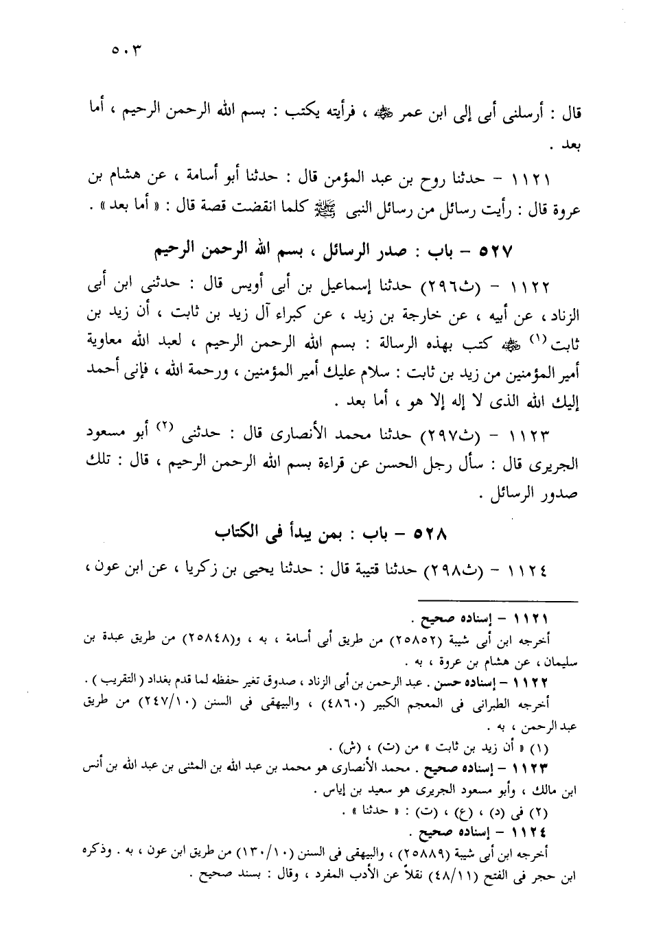 1121- حَدثنا رَوْحُ بْنُ عَبْدِ الْمُؤْمِنِ، قَالَ: حَدثنا أَبُو أُسَامَةَ، عَنْ هِشَامِ بْنِ عُرْوَةَ قَالَ: رَأَيْتُ رَسَائِلَ مِنْ رَسَائِلِ النَّبِيِّ صَلى الله عَلَيهِ وسَلم، كُلَّمَا انْقَضَتْ قِصَّةٌ قَالَ: أَمَّا بَعْدُ.