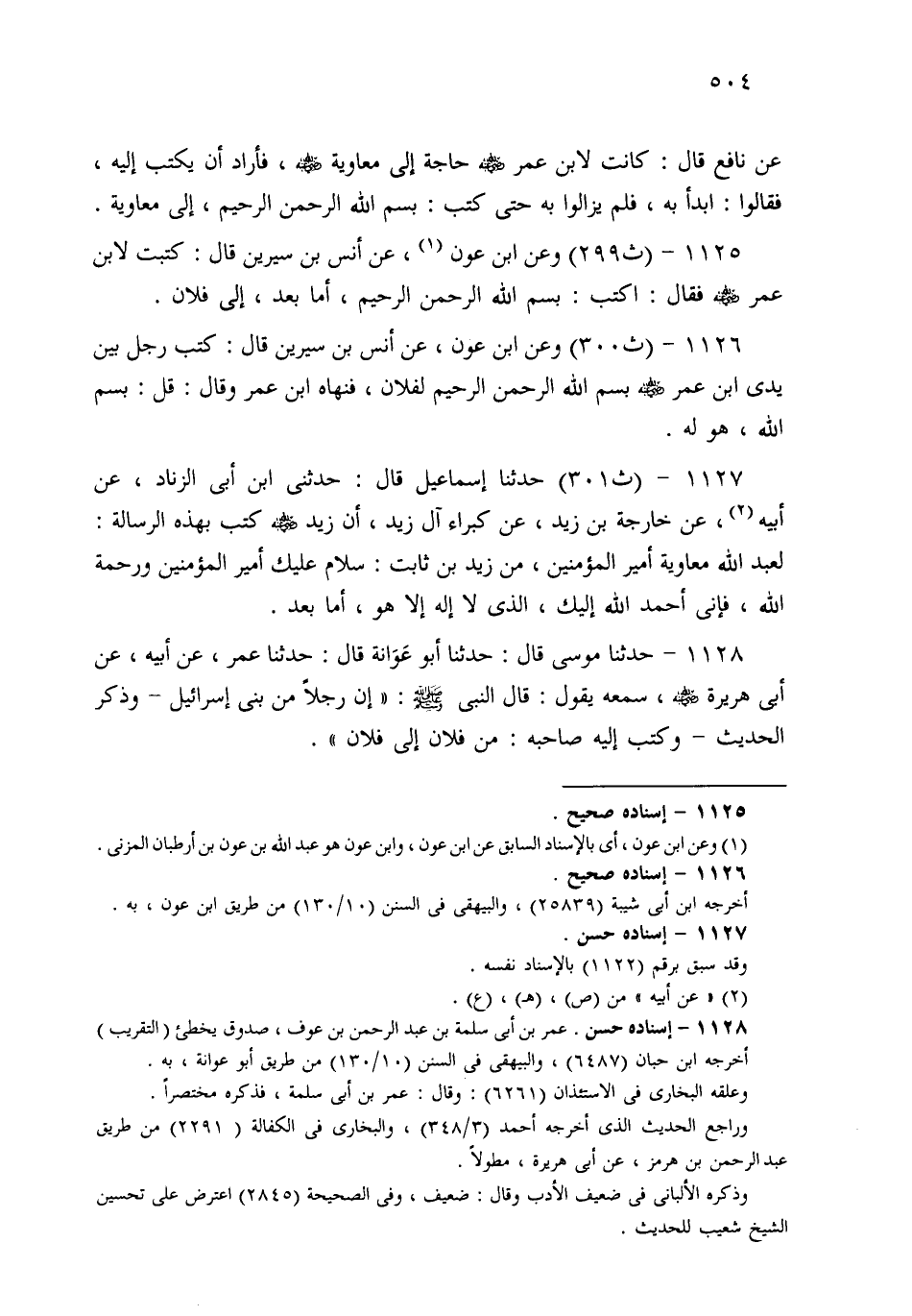 1127- حَدثنا إِسْمَاعِيلُ قَالَ: حَدَّثَنِي ابْنُ أَبِي الزِّنَادِ، عَنْ أَبِيهِ، عَنْ خَارِجَةَ بْنِ زَيْدٍ، عَنْ كُبَرَاءِ آلِ زَيْدٍ، أَنَّ زَيْدًا كَتَبَ بِهَذِهِ الرِّسَالَةِ: لِعَبْدِ اللهِ مُعَاوِيَةَ أَمِيرِ الْمُؤْمِنِينَ، مِنْ زَيْدِ بْنِ ثَابِتٍ: سَلاَمٌ عَلَيْكَ أَمِيرَ الْمُؤْمِنِينَ وَرَحْمَةُ اللهِ، فَإِنِّي أَحْمَدُ إِلَيْكَ اللهَ الَّذِي لاَ إِلَهَ إِلاَّ هُوَ، أَمَّا بَعْدُ.