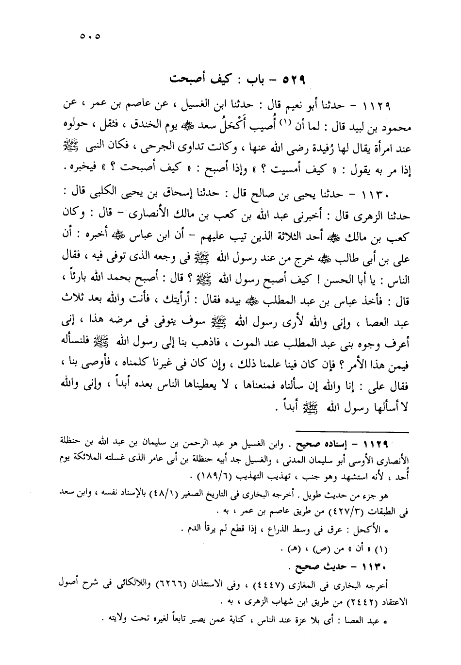 1130- حَدثنا يَحْيَى بْنُ صَالِحٍ، قَالَ: حَدثنا إِسْحَاقُ بْنُ يَحْيَى الْكَلْبِيُّ، قَالَ: حَدثنا الزُّهْرِيُّ قَالَ: أَخْبَرَنِي عَبْدُ اللهِ بْنُ كَعْبِ بْنِ مَالِكٍ الأَنْصَارِيُّ، قَالَ: وَكَانَ كَعْبُ بْنُ مَالِكٍ أَحَدَ الثَّلاَثَةِ الَّذِينَ تِيبَ عَلَيْهِمْ، أَنَّ ابْنَ عَبَّاسٍ أَخْبَرَهُ، أَنَّ عَلِيَّ بْنَ أَبِي طَالِبٍ رَضِيَ اللهُ عَنْهُ خَرَجَ مِنْ عِنْدِ رَسُولِ اللهِ صَلى الله عَلَيهِ وسَلم فِي وَجَعِهِ الَّذِي تُوُفِّيَ فِيهِ، فَقَالَ النَّاسُ: يَا أَبَا الْحَسَنِ، كَيْفَ أَصْبَحَ رَسُولُ اللهِ صَلى الله عَلَيهِ وسَلم؟ قَالَ: أَصْبَحَ بِحَمْدِ اللهِ بَارِئًا، قَالَ: فَأَخَذَ عَبَّاسُ بْنُ عَبْدِ الْمُطَّلِبِ بِيَدِهِ، فَقَالَ: أَرَأَيْتُكَ؟ فَأَنْتَ وَاللَّهِ بَعْدَ ثَلاَثٍ عَبْدُ الْعَصَا، وَإِنِّي وَاللَّهِ لَأَرَى رَسُولَ اللهِ صَلى الله عَلَيهِ وسَلم سَوْفَ يُتَوَفَّى فِي مَرَضِهِ هَذَا، إِنِّي أَعْرِفُ وُجُوهَ بَنِي عَبْدِ الْمُطَّلِبِ عِنْدَ الْمَوْتِ، فَاذْهَبْ بِنَا إِلَى رَسُولِ اللهِ صَلى الله عَلَيهِ وسَلم فَلْنَسْأَلْهُ: فِيمَنْ هَذَا الأَمْرُ؟ فَإِنْ كَانَ فِينَا عَلِمْنَا ذَلِكَ، وَإِنْ كَانَ فِي غَيْرِنَا كَلَّمْنَاهُ فَأَوْصَى بِنَا، فَقَالَ عَلِيٌّ: إِنَّا وَاللَّهِ إِنْ سَأَلْنَاهُ فَمَنَعَنَاهَا لاَ يُعْطِينَاهَا النَّاسُ بَعْدَهُ أَبَدًا، وَإِنِّي وَاللَّهِ لاَ أَسْأَلُهَا رَسُولَ اللهِ صَلى الله عَلَيهِ وسَلم أَبَدًا.
