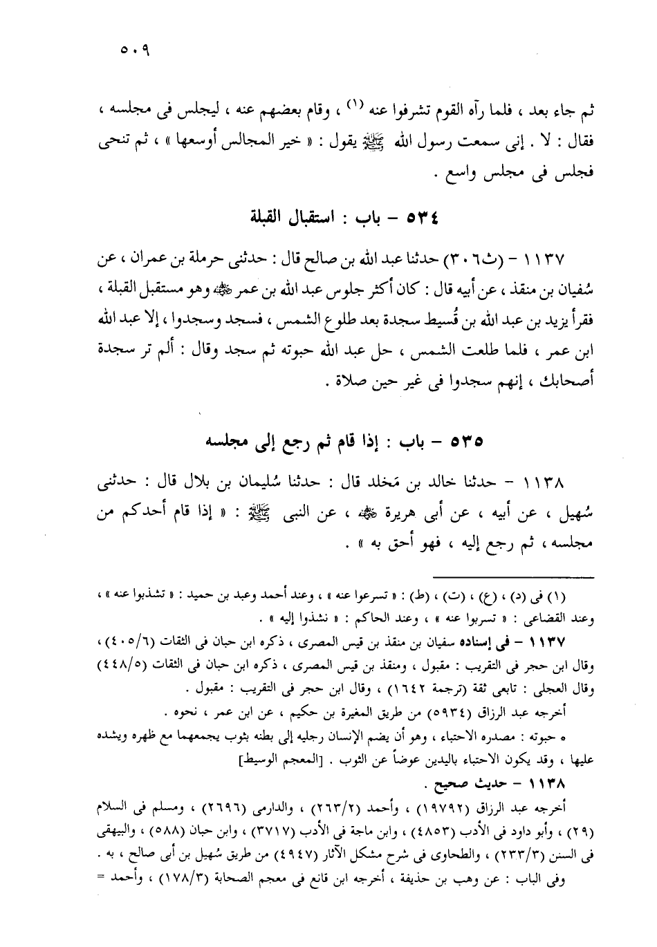 1137- حَدثنا عَبْدُ اللهِ بْنُ صَالِحٍ قَالَ: حَدَّثَنِي حَرْمَلَةُ بْنُ عِمْرَانَ، عَنْ سُفْيَانَ بْنِ مُنْقِذٍ، عَنْ أَبِيهِ قَالَ: كَانَ أَكْثَرُ جُلُوسِ عَبْدِ اللهِ بْنِ عُمَرَ وَهُوَ مُسْتَقْبِلٌ الْقِبْلَةَ، فَقَرَأَ يَزِيدُ بْنُ عَبْدِ اللهِ بْنِ قُسَيْطٍ سَجْدَةً بَعْدَ طُلُوعِ الشَّمْسِ فَسَجَدَ وَسَجَدُوا إِلاَّ عَبْدَ اللهِ بْنَ عُمَرَ، فَلَمَّا طَلَعَتِ الشَّمْسُ حَلَّ عَبْدُ اللهِ حَبْوَتَهُ ثُمَّ سَجَدَ وَقَالَ: أَلَمْ تَرَ سَجْدَةَ أَصْحَابِكَ؟ إِنَّهُمْ سَجَدُوا فِي غَيْرِ حِينِ صَلاةٍ.