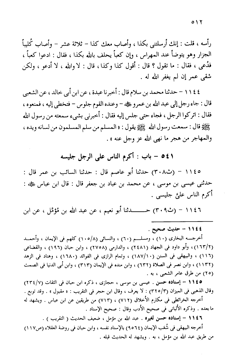 1144- حَدثنا مُحَمَّدُ بْنُ سَلاَمٍ، قَالَ: أَخْبَرَنَا عَبْدَةُ، عَنِ ابْنِ أَبِي خَالِدٍ، عَنِ الشَّعْبِيِّ قَالَ: جَاءَ رَجُلٌ إِلَى عَبْدِ اللهِ بْنِ عَمْرٍو، وَعِنْدَهُ الْقَوْمُ جُلُوسٌ، يَتَخَطَّى إِلَيْهِ، فَمَنَعُوهُ، فَقَالَ: اتْرُكُوا الرَّجُلَ، فَجَاءَ حَتَّى جَلَسَ إِلَيْهِ، فَقَالَ: أَخْبِرْنِي بِشَيْءٍ سَمِعْتَهُ مِنْ رَسُولِ اللهِ صَلى الله عَلَيهِ وسَلم، قَالَ: سَمِعْتُ رَسُولَ اللهِ صَلى الله عَلَيهِ وسَلم يَقُولُ: الْمُسْلِمُ مِنْ سَلِمَ الْمُسْلِمُونَ مِنْ لِسَانِهِ وَيَدِهِ، وَالْمُهَاجِرُ مَنْ هَجَرَ مَا نَهَى اللهُ عَنْهُ.