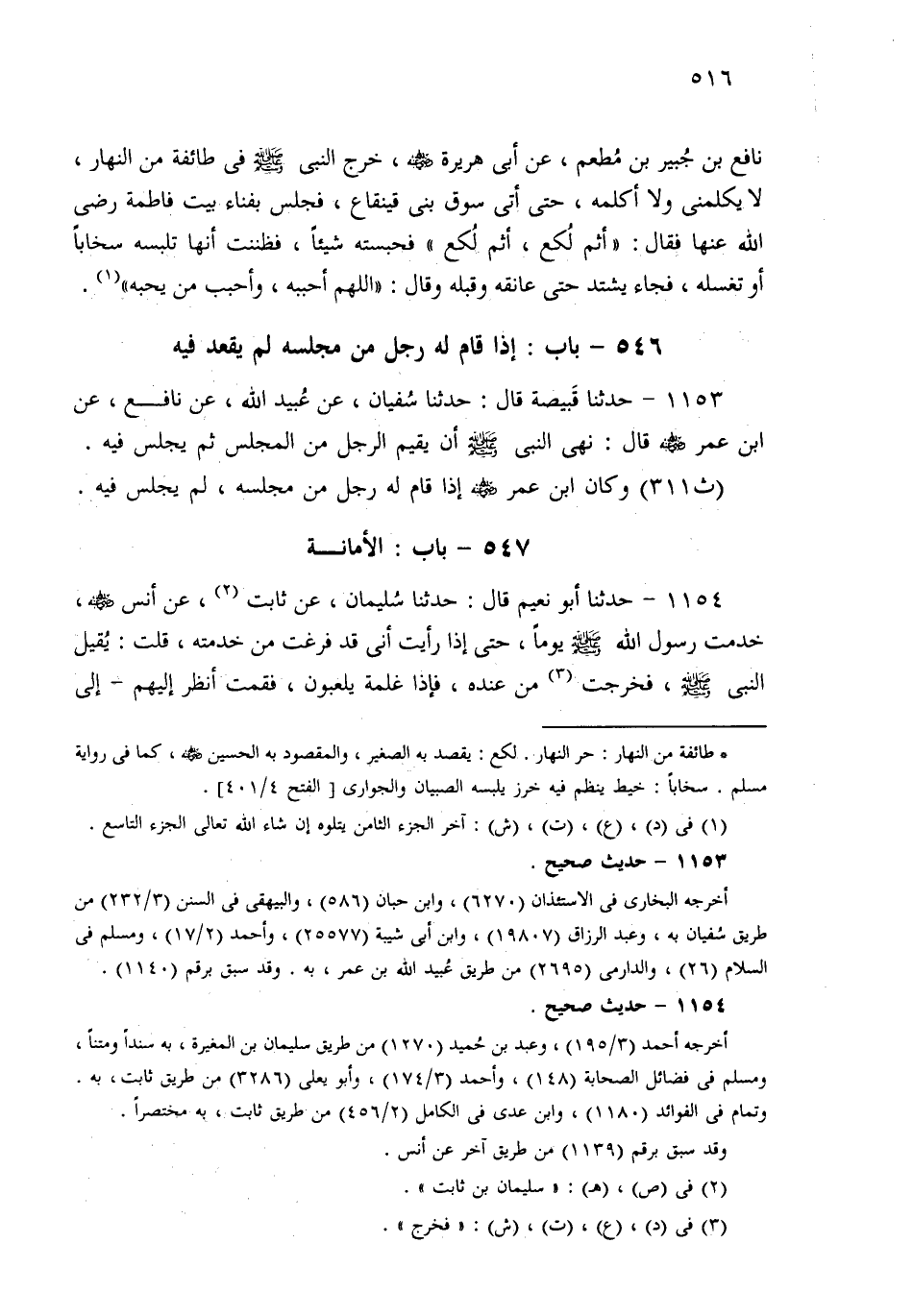 1154- حَدثنا أَبُو نُعَيْمٍ، قَالَ: حَدثنا سُلَيْمَانُ، عَنْ ثَابِتٍ، عَنْ أَنَسٍ: خَدَمْتُ رَسُولَ اللهِ صَلى الله عَلَيهِ وسَلم يَوْمًا، حَتَّى إِذَا رَأَيْتُ أَنِّي قَدْ فَرَغْتُ مِنْ خِدْمَتِهِ قُلْتُ: يَقِيلُ النَّبِيُّ صَلى الله عَلَيهِ وسَلم، فَخَرَجْتُ مِنْ عِنْدِهِ، فَإِذَا غِلْمَةٌ يَلْعَبُونَ، فَقُمْتُ أَنْظُرُ إِلَيْهِمْ إِلَى لَعِبِهِمْ، فَجَاءَ النَّبِيُّ صَلى الله عَلَيهِ وسَلم فَانْتَهَى إِلَيْهِمْ فَسَلَّمَ عَلَيْهِمْ، ثُمَّ دَعَانِي فَبَعَثَنِي إِلَى حَاجَةٍ، فَكَانَ فِي فَيْءٍ حَتَّى أَتَيْتُهُ، وَأَبْطَأْتُ عَلَى أُمِّي، فَقَالَتْ: مَا حَبَسَكَ؟ قُلْتُ: بَعَثَنِي النَّبِيُّ صَلى الله عَلَيهِ وسَلم إِلَى حَاجَةٍ، قَالَتْ: مَا هِيَ؟ قُلْتُ: إِنَّهُ سِرٌّ لِلنَّبِيِّ صَلى الله عَلَيهِ وسَلم، فَقَالَتِ: احْفَظْ عَلَى رَسُولِ اللهِ صَلى الله عَلَيهِ وسَلم سِرَّهُ، فَمَا حَدَّثْتُ بِتِلْكَ الْحَاجَةِ أَحَدًا مِنَ الْخَلْقِ، فَلَوْ كُنْتُ مُحَدِّثًا حَدَّثْتُكَ بِهَا.