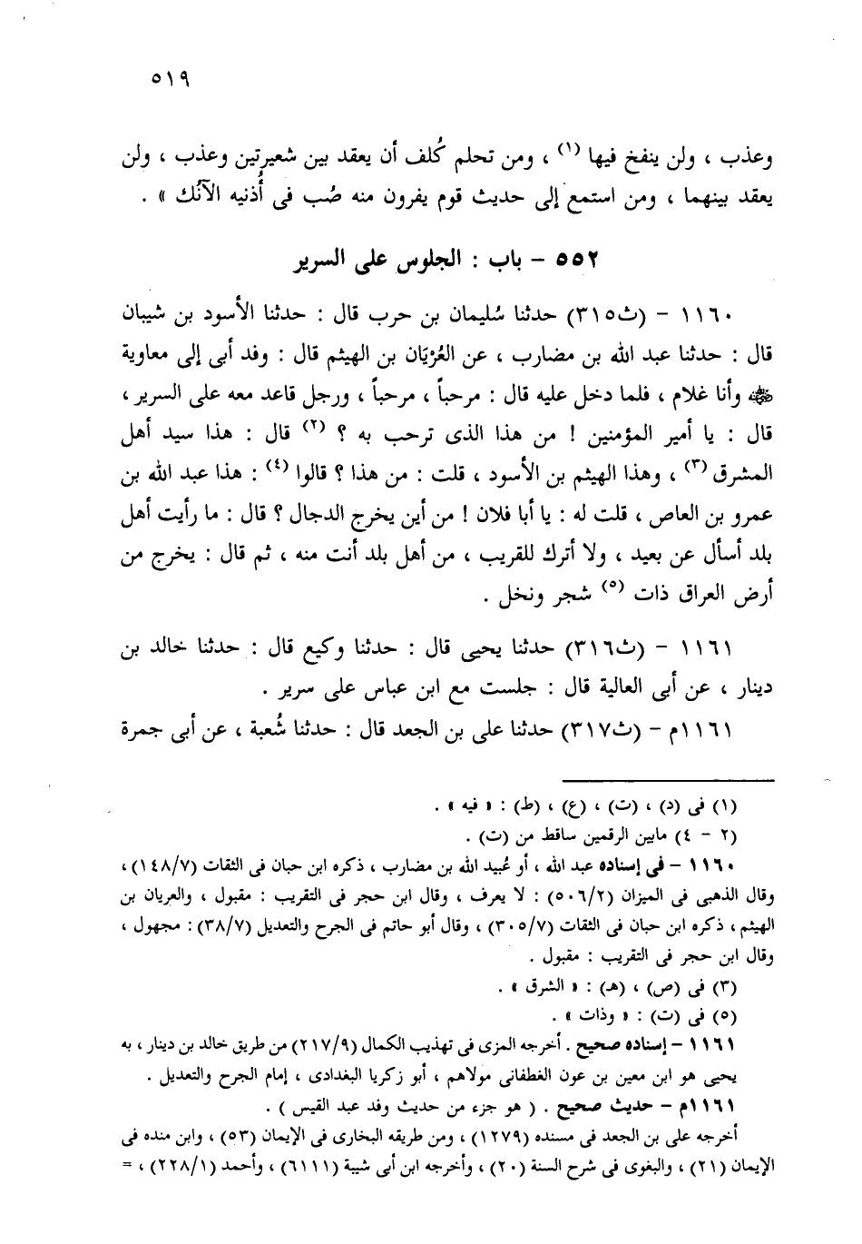 1160- حَدثنا سُلَيْمَانُ بْنُ حَرْبٍ، قَالَ: حَدثنا الأَسْوَدُ بْنُ شَيْبَانَ، قَالَ: حَدثنا عَبْدُ اللهِ بْنُ مُضَارِبٍ، عَنِ الْعُرْيَانِ بْنِ الْهَيْثَمِ قَالَ: وَفَدَ أَبِي إِلَى مُعَاوِيَةَ، وَأَنَا غُلاَمٌ، فَلَمَّا دَخَلَ عَلَيْهِ قَالَ: مَرْحَبًا مَرْحَبًا، وَرَجُلٌ قَاعِدٌ مَعَهُ عَلَى السَّرِيرِ، قَالَ: يَا أَمِيرَ الْمُؤْمِنِينَ، مَنْ هَذَا الَّذِي تُرَحِّبُ بِهِ؟ قَالَ: هَذَا سَيِّدُ أَهْلِ الْمَشْرِقِ، وَهَذَا الْهَيْثَمُ بْنُ الأَسْوَدِ، قُلْتُ: مَنْ هَذَا؟ قَالُوا: هَذَا عَبْدُ اللهِ بْنُ عَمْرِو بْنِ الْعَاصِ، قُلْتُ لَهُ: يَا أَبَا فُلاَنٍ، مِنْ أَيْنَ يَخْرُجُ الدَّجَّالُ؟ قَالَ: مَا رَأَيْتُ أَهْلَ بَلَدٍ أَسْأَلَ عَنْ بَعِيدٍ، وَلاَ أَتْرَكَ لِلْقَرِيبِ مِنْ أَهْلِ بَلَدٍ أَنْتَ مِنْهُ، ثُمَّ قَالَ: يَخْرُجُ مِنْ أَرْضِ الْعِرَاقِ، ذَاتِ شَجَرٍ وَنَخْلٍ.