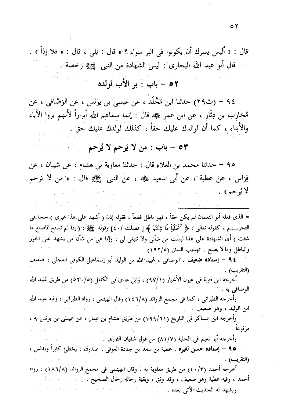 95- حَدثنا مُحَمَّدُ بْنُ الْعَلاءِ، قَالَ: حَدثنا مُعَاوِيَةُ بْنُ هِشَامٍ، عَنْ شَيْبَانَ، عَنْ فِرَاسٍ، عَنْ عَطِيَّةَ، عَنْ أَبِي سَعِيدٍ، عَنِ النَّبِيِّ صَلى الله عَلَيهِ وسَلم قَالَ: مَنْ لاَ يَرْحَمُ لاَ يُرْحَمُ.