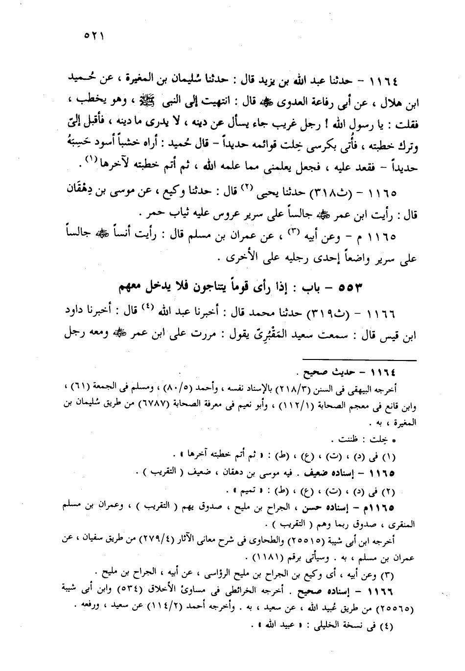 1164- حَدثنا عَبْدُ اللهِ بْنُ يَزِيدَ، قَالَ: حَدثنا سُلَيْمَانُ بْنُ الْمُغِيرَةِ، عَنْ حُمَيْدِ بْنِ هِلاَلٍ، عَنْ أَبِي رِفَاعَةَ الْعَدَوِيِّ قَالَ: انْتَهَيْتُ إِلَى النَّبِيِّ صَلى الله عَلَيهِ وسَلم وَهُوَ يَخْطُبُ، فَقُلْتُ: يَا رَسُولَ اللهِ، رَجُلٌ غَرِيبٌ جَاءَ يَسْأَلُ عَنْ دِينِهِ، لاَ يَدْرِي مَا دِينُهُ، فَأَقْبَلَ إِلَيَّ وَتَرَكَ خُطْبَتَهُ، فَأَتَى بِكُرْسِيٍّ خِلْتُ قَوَائِمَهُ حَدِيدًا، قَالَ حُمَيْدٌ: أُرَاهُ خَشَبًا أَسْوَدَ حَسَبُهُ حَدِيدًا، فَقَعَدَ عَلَيْهِ، فَجَعَلَ يُعَلِّمُنِي مِمَّا عَلَّمَهُ اللَّهُ، ثُمَّ أَتَمَّ خُطْبَتَهُ، آخِرَهَا.