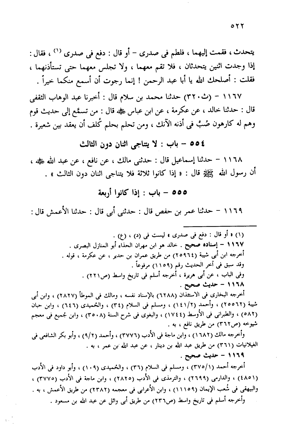 1168- حَدثنا إِسْمَاعِيلُ قَالَ: حَدَّثَنِي مَالِكٌ، عَنْ نَافِعٍ، عَنْ عَبْدِ اللهِ، أَنَّ رَسُولَ اللهِ صَلى الله عَلَيهِ وسَلم قَالَ: إِذَا كَانُوا ثَلاَثَةً، فَلاَ يَتَنَاجَى اثْنَانِ دُونَ الثَّالِثِ.