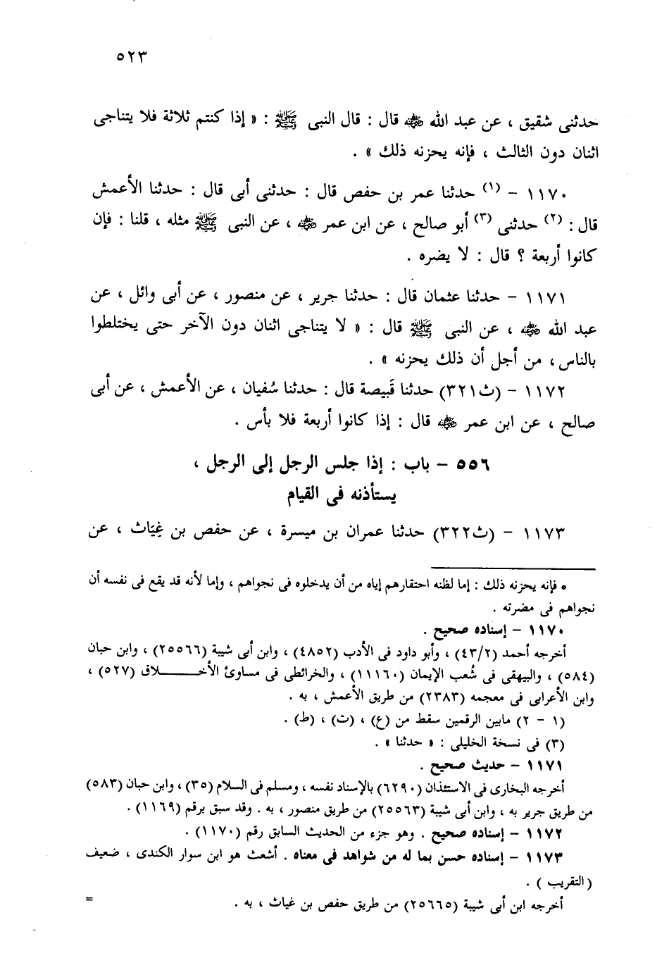 1171- حَدثنا عُثْمَانُ، قَالَ: حَدثنا جَرِيرٌ، عَنْ مَنْصُورٍ، عَنْ أَبِي وَائِلٍ، عَنْ عَبْدِ اللهِ، عَنِ النَّبِيِّ صَلى الله عَلَيهِ وسَلم قَالَ: لاَ يَتَنَاجَى اثْنَانِ دُونَ الآخَرِ حَتَّى يَخْتَلِطُوا بِالنَّاسِ، مِنْ أَجْلِ أَنَّ ذَلِكَ يُحْزِنُهُ.