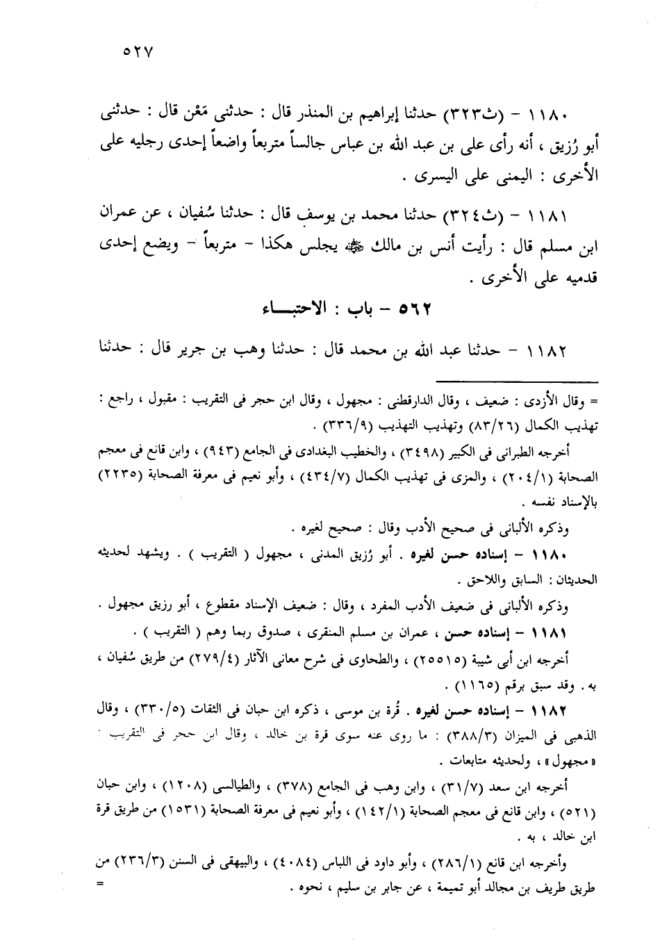 1180- حَدثنا إِبْرَاهِيمُ بْنُ الْمُنْذِرِ قَالَ: حَدَّثَنِي مَعْنٌ قَالَ: حَدَّثَنِي أَبُو رُزَيْقٍ، أَنَّهُ رَأَى عَلِيَّ بْنَ عَبْدِ اللهِ بْنِ عَبَّاسٍ، جَالِسًا مُتَرَبِّعًا، وَاضِعًا إِحْدَى رِجْلَيْهِ عَلَى الأُخْرَى، الْيُمْنَى عَلَى الْيُسْرَى.