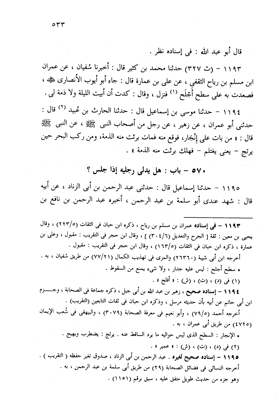 1193- حَدثنا مُحَمَّدُ بْنُ كَثِيرٍ، قَالَ: أَخْبَرَنَا سُفْيَانُ، عَنْ عِمْرَانَ بْنِ مُسْلِمِ بْنِ رِيَاحٍ الثَّقَفِيِّ، عَنْ عَلِيِّ بْنِ عُمَارَةَ قَالَ: جَاءَ أَبُو أَيُّوبَ الأَنْصَارِيُّ، فَصَعِدْتُ بِهِ عَلَى سَطْحٍ أَجْلَحَ، فَنَزَلَ وَقَالَ: كِدْتُ أَنْ أَبِيتَ اللَّيْلَةَ وَلاَ ذِمَّةَ لِي.