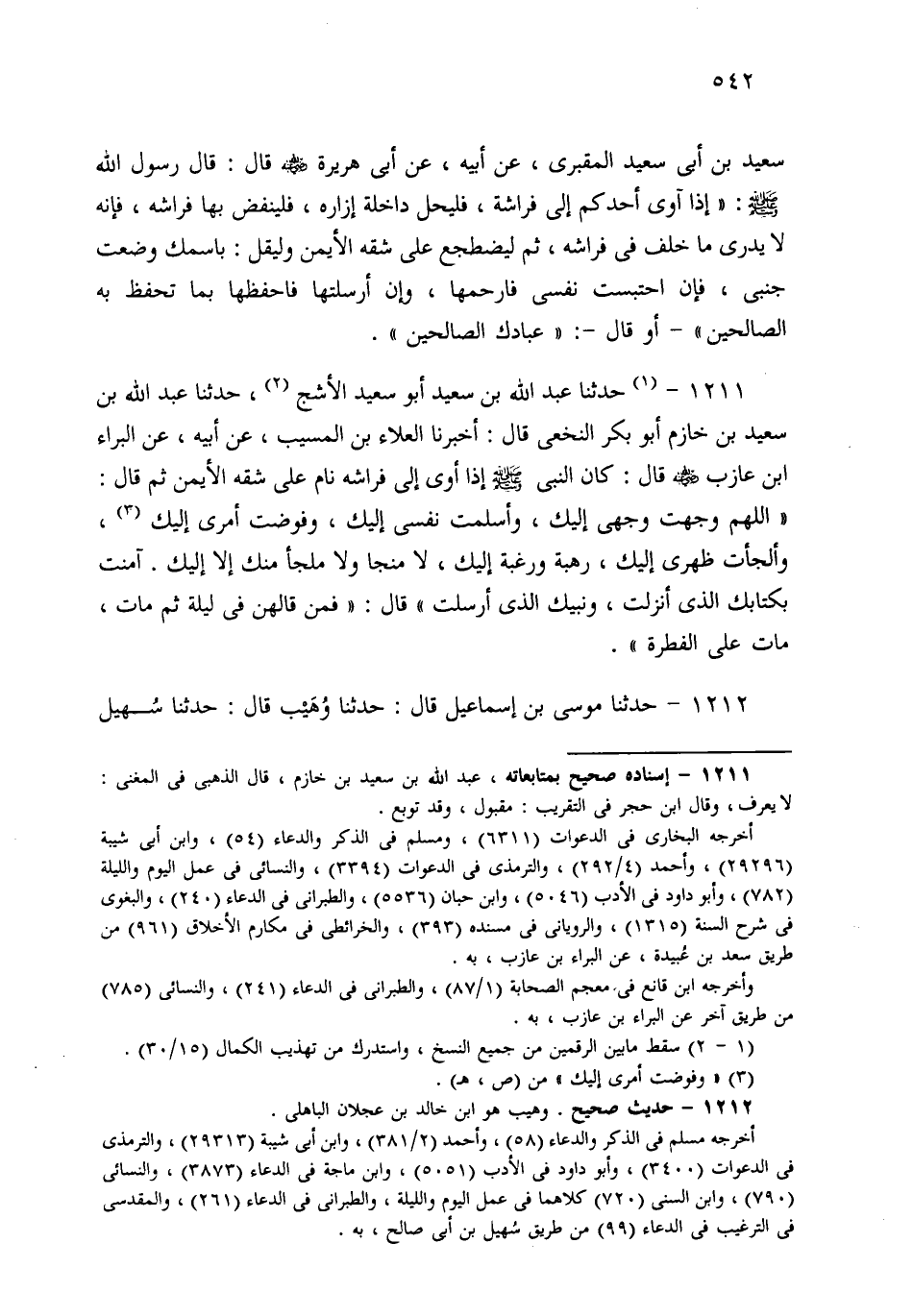1211- حَدثنا عَبْدُ اللهِ بْنُ سَعِيدٍ، أَبُو سَعِيدٍ الأَشَجُّ، قَالَ: حَدثنا عَبْدُ اللهِ بْنُ سَعِيدِ بْنِ خَازِمٍ أَبُو بَكْرٍ النَّخَعِيُّ، قَالَ: أَخْبَرَنَا الْعَلاَءُ بْنُ الْمُسَيَّبِ، عَنْ أَبِيهِ، عَنِ الْبَرَاءِ بْنِ عَازِبٍ قَالَ: كَانَ النَّبِيُّ صَلى الله عَلَيهِ وسَلم إِذَا أَوَى إِلَى فِرَاشِهِ نَامَ عَلَى شِقِّهِ الأَيْمَنِ، ثُمَّ قَالَ: اللَّهُمَّ وَجَّهْتُ وَجْهِي إِلَيْكَ، وَأَسْلَمْتُ نَفْسِي إِلَيْكَ، وَأَلْجَأْتُ ظَهْرِي إِلَيْكَ، رَهْبَةً وَرَغْبَةً إِلَيْكَ، لاَ مَنْجَا وَلاَ مَلْجَأَ مِنْكَ إِلاَّ إِلَيْكَ، آمَنْتُ بِكِتَابِكَ الَّذِي أَنْزَلْتَ، وَنَبِيِّكَ الَّذِي أَرْسَلْتَ، قَالَ: فَمَنْ قَالَهُنَّ فِي لَيْلَةٍ ثُمَّ مَاتَ مَاتَ عَلَى الْفِطْرَةِ.