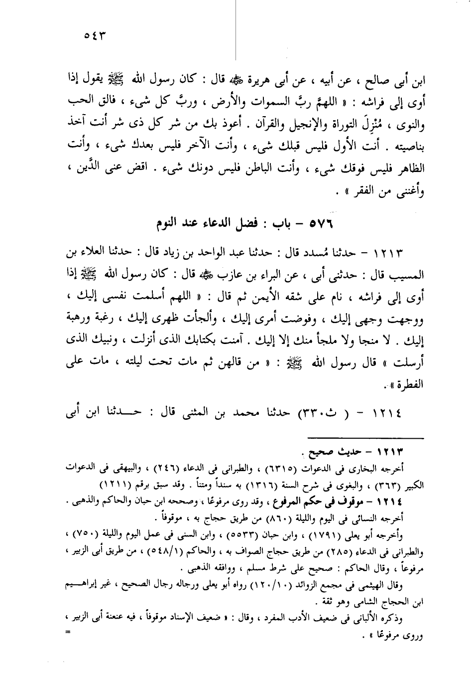 1213- حَدثنا مُسَدَّدٌ، قَالَ: حَدثنا عَبْدُ الْوَاحِدِ بْنُ زِيَادٍ، قَالَ: حَدثنا الْعَلاَءُ بْنُ الْمُسَيَّبِ قَالَ: حَدَّثَنِي أَبِي، عَنِ الْبَرَاءِ بْنِ عَازِبٍ قَالَ: كَانَ رَسُولُ اللهِ صَلى الله عَلَيهِ وسَلم إِذَا أَوَى إِلَى فِرَاشِهِ نَامَ عَلَى شِقِّهِ الأَيْمَنِ، ثُمَّ قَالَ: اللَّهُمَّ أَسْلَمْتُ نَفْسِي إِلَيْكَ، وَوَجَّهْتُ بِوَجْهِي إِلَيْكَ، وَفَوَّضْتُ أَمْرِي إِلَيْكَ، وَأَلْجَأْتُ ظَهْرِي إِلَيْكَ، رَغْبَةً وَرَهْبَةً إِلَيْكَ، لاَ مَنْجَا وَلاَ مَلْجَأَ مِنْكَ إِلاَّ إِلَيْكَ، آمَنْتُ بِكِتَابِكَ الَّذِي أَنْزَلْتَ، وَنَبِيِّكَ الَّذِي أَرْسَلْتَ، قَالَ رَسُولُ اللهِ صَلى الله عَلَيهِ وسَلم: مَنْ قَالَهُنَّ ثُمَّ مَاتَ تَحْتَ لَيْلَتِهِ مَاتَ عَلَى الْفِطْرَةِ.
