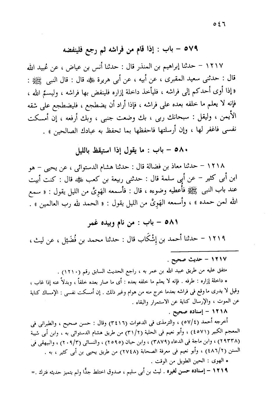 1217- حَدثنا إِبْرَاهِيمُ بْنُ الْمُنْذِرِ، قَالَ: حَدثنا أَنَسُ بْنُ عِيَاضٍ، عَنْ عُبَيْدِ اللهِ قَالَ: حَدَّثَنِي سَعِيدٌ الْمَقْبُرِيُّ، عَنْ أَبِيهِ، عَنْ أَبِي هُرَيْرَةَ قَالَ: قَالَ النَّبِيُّ صَلى الله عَلَيهِ وسَلم: إِذَا أَوَى أَحَدُكُمْ إِلَى فِرَاشِهِ فَلْيَأْخُذْ دَاخِلَةَ إِزَارِهِ، فَلْيَنْفُضْ بِهَا فِرَاشَهُ وَلْيُسَمِّ اللهَ، فَإِنَّهُ لاَ يَعْلَمُ مَا خَلَّفَهُ بَعْدَهُ عَلَى فِرَاشِهِ، فَإِذَا أَرَادَ أَنْ يَضْطَجِعَ فَلْيَضْطَجِعْ عَلَى شِقِّهِ الأَيْمَنِ وَلْيَقُلْ: سُبْحَانَكَ رَبِّي، بِكَ وَضَعْتُ جَنْبِي، وَبِكَ أَرْفَعُهُ، إِنْ أَمْسَكْتَ نَفْسِي فَاغْفِرْ لَهَا، وَإِنْ أَرْسَلْتَهَا فَاحْفَظْهَا بِمَا تَحْفَظُ بِهِ عِبَادَكَ الصَّالِحِينَ.
