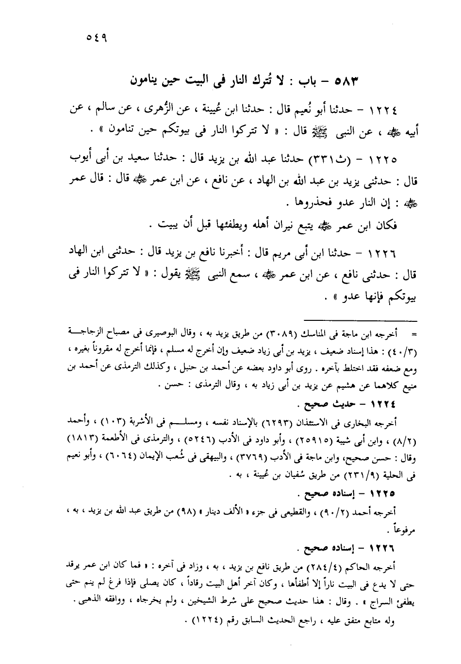 1226- حَدثنا ابْنُ أَبِي مَرْيَمَ، قَالَ: أَخْبَرَنَا نَافِعُ بْنُ يَزِيدَ قَالَ: حَدَّثَنِي ابْنُ الْهَادِ قَالَ: حَدَّثَنِي نَافِعٌ، عَنِ ابْنِ عُمَرَ، سَمِعَ النَّبِيَّ صَلى الله عَلَيهِ وسَلم يَقُولُ: لاَ تَتْرُكُوا النَّارَ فِي بُيُوتِكُمْ، فَإِنَّهَا عَدُوٌّ.