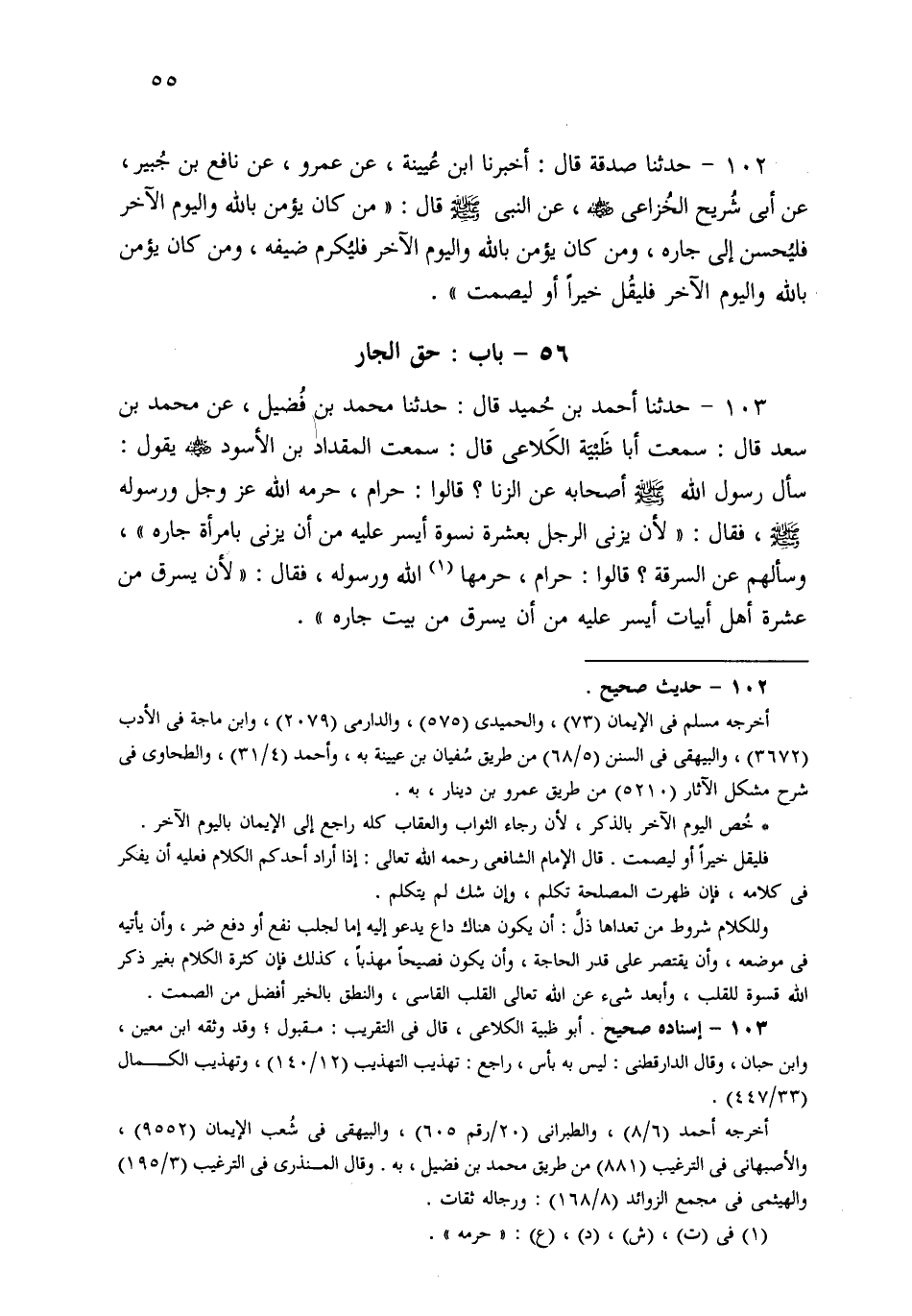 102- حَدثنا صَدَقَةُ، قَالَ: أَخْبَرَنَا ابْنُ عُيَيْنَةَ، عَنْ عَمْرٍو، عَنْ نَافِعِ بْنِ جُبَيْرٍ، عَنْ أَبِي شُرَيْحٍ الْخُزَاعِيِّ، عَنِ النَّبِيِّ صَلى الله عَلَيهِ وسَلم قَالَ: مَنْ كَانَ يُؤْمِنُ بِاللهِ وَالْيَوْمِ الآخِرِ فَلْيُحْسِنْ إِلَى جَارِهِ، وَمَنْ كَانَ يُؤْمِنُ بِاللهِ وَالْيَوْمِ الآخِرِ فَلْيُكْرِمْ ضَيْفَهُ، وَمَنْ كَانَ يُؤْمِنُ بِاللهِ وَالْيَوْمِ الآخِرِ فَلْيَقُلْ خَيْرًا أَوْ لِيَصْمُتْ.