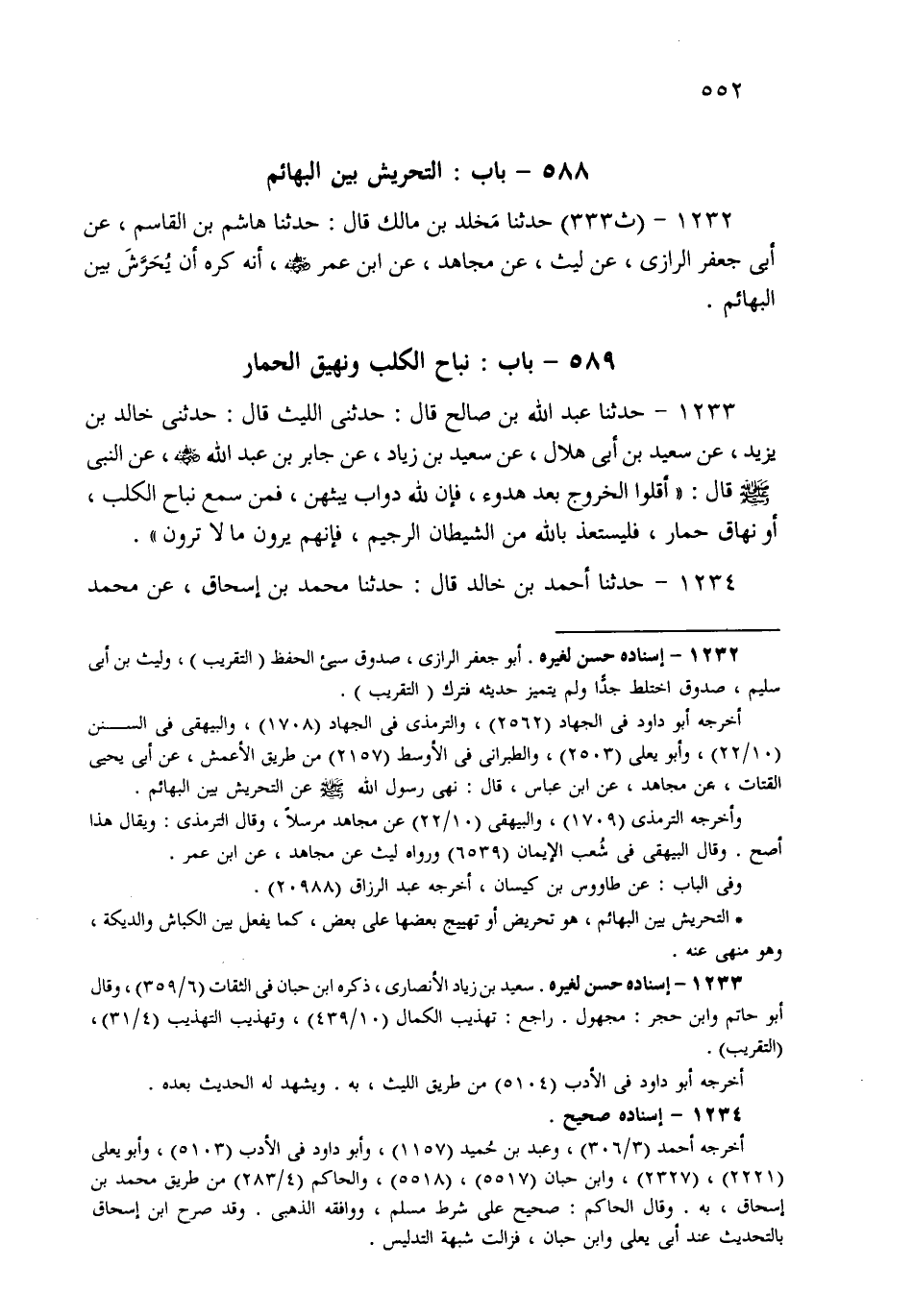 1232- حَدثنا مَخْلَدُ بْنُ مَالِكٍ، قَالَ: حَدثنا هَاشِمُ بْنُ الْقَاسِمِ، عَنْ أَبِي جَعْفَرٍ الرَّازِيِّ، عَنْ لَيْثٍ، عَنْ مُجَاهِدٍ، عَنِ ابْنِ عُمَرَ، أَنَّهُ كَرِهَ أَنْ يُحَرِّشَ بَيْنَ الْبَهَائِمِ.
