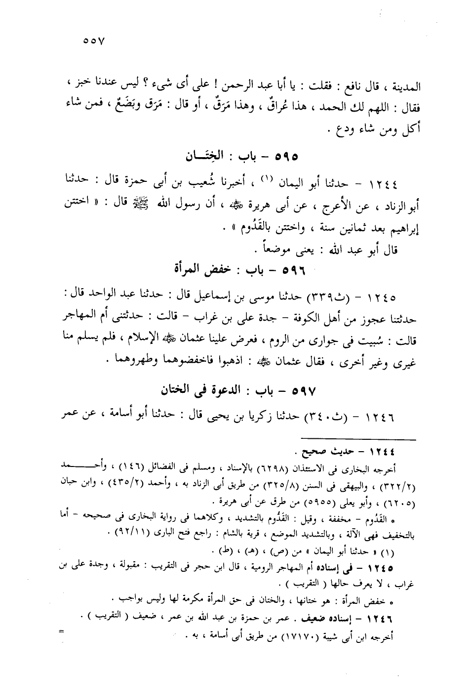 1245- حَدثنا مُوسَى بْنُ إِسْمَاعِيلَ، قَالَ: حَدثنا عَبْدُ الْوَاحِدِ قَالَ: حَدَّثَتْنَا عَجُوزٌ مِنْ أَهْلِ الْكُوفَةِ جَدَّةُ عَلِيِّ بْنِ غُرَابٍ قَالَتْ: حَدَّثَتْنِي أُمُّ الْمُهَاجِرِ قَالَتْ: سُبِيتُ فِي جَوَارِي مِنَ الرُّومِ، فَعَرَضَ عَلَيْنَا عُثْمَانُ الإِسْلاَمَ، فَلَمْ يُسْلِمْ مِنَّا غَيْرِي وَغَيْرُ أُخْرَى، فَقَالَ عُثْمَانُ: اذْهَبُوا فَاخْفِضُوهُمَا، وَطَهِّرُوهُمَا.