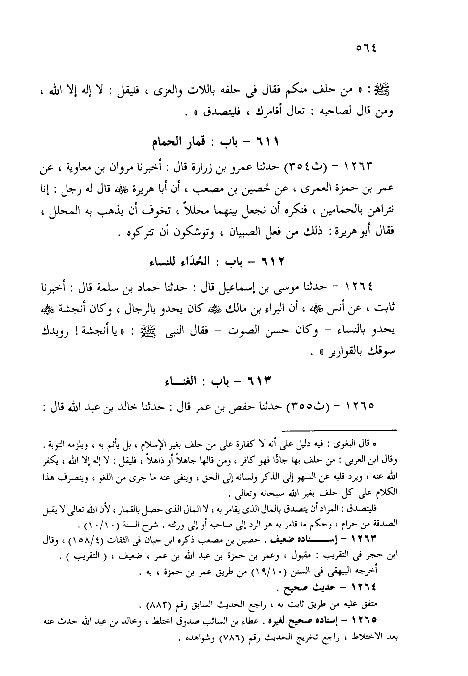 1264- حَدثنا مُوسَى بْنُ إِسْمَاعِيلَ، قَالَ: حَدثنا حَمَّادُ بْنُ سَلَمَةَ، قَالَ: أَخْبَرَنَا ثَابِتٌ، عَنْ أَنَسٍ، أَنَّ الْبَرَاءَ بْنَ مَالِكٍ كَانَ يَحْدُو بِالرِّجَالِ، وَكَانَ أَنْجَشَةُ يَحْدُو بِالنِّسَاءِ، وَكَانَ حَسَنَ الصَّوْتِ، فَقَالَ النَّبِيُّ صَلى الله عَلَيهِ وسَلم: يَا أَنْجَشَةُ، رُوَيْدَكَ سَوْقَكَ بِالْقَوَارِيرِ.