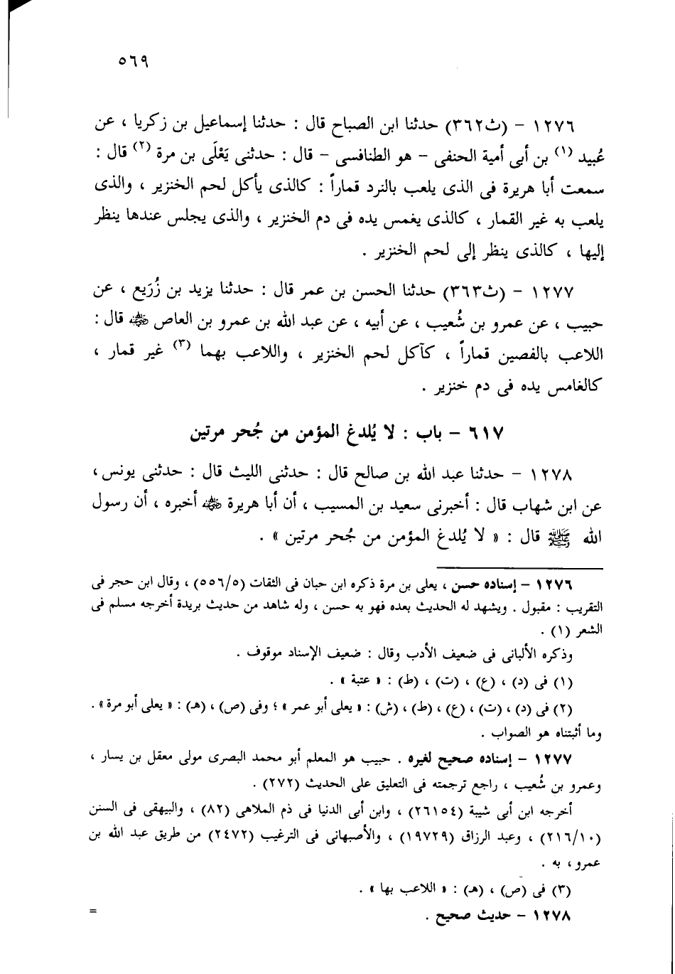 1276- حَدثنا ابْنُ الصَّبَّاحِ، قَالَ: حَدثنا إِسْمَاعِيلُ بْنُ زَكَرِيَّا، عَنْ عُبَيْدِ بْنِ أَبِي أُمَيَّةَ الْحَنَفِيِّ هُوَ الطَّنَافِسِيُّ، قَالَ: حَدَّثَنِي يَعْلَى أَبُو مُرَّةَ قَالَ: سَمِعْتُ أَبَا هُرَيْرَةَ فِي الَّذِي يَلْعَبُ بِالنَّرْدِ قِمَارًا: كَالَّذِي يَأْكُلُ لَحْمَ الْخِنْزِيرِ، وَالَّذِي يَلْعَبُ بِهِ مِنْ غَيْرِ الْقِمَارِ كَالَّذِي يَغْمِسُ يَدَهُ فِي دَمِ خِنْزِيرٍ، وَالَّذِي يَجْلِسُ عِنْدَهَا يَنْظُرُ إِلَيْهَا كَالَّذِي يَنْظُرُ إِلَى لَحْمِ الْخِنْزِيرِ.
