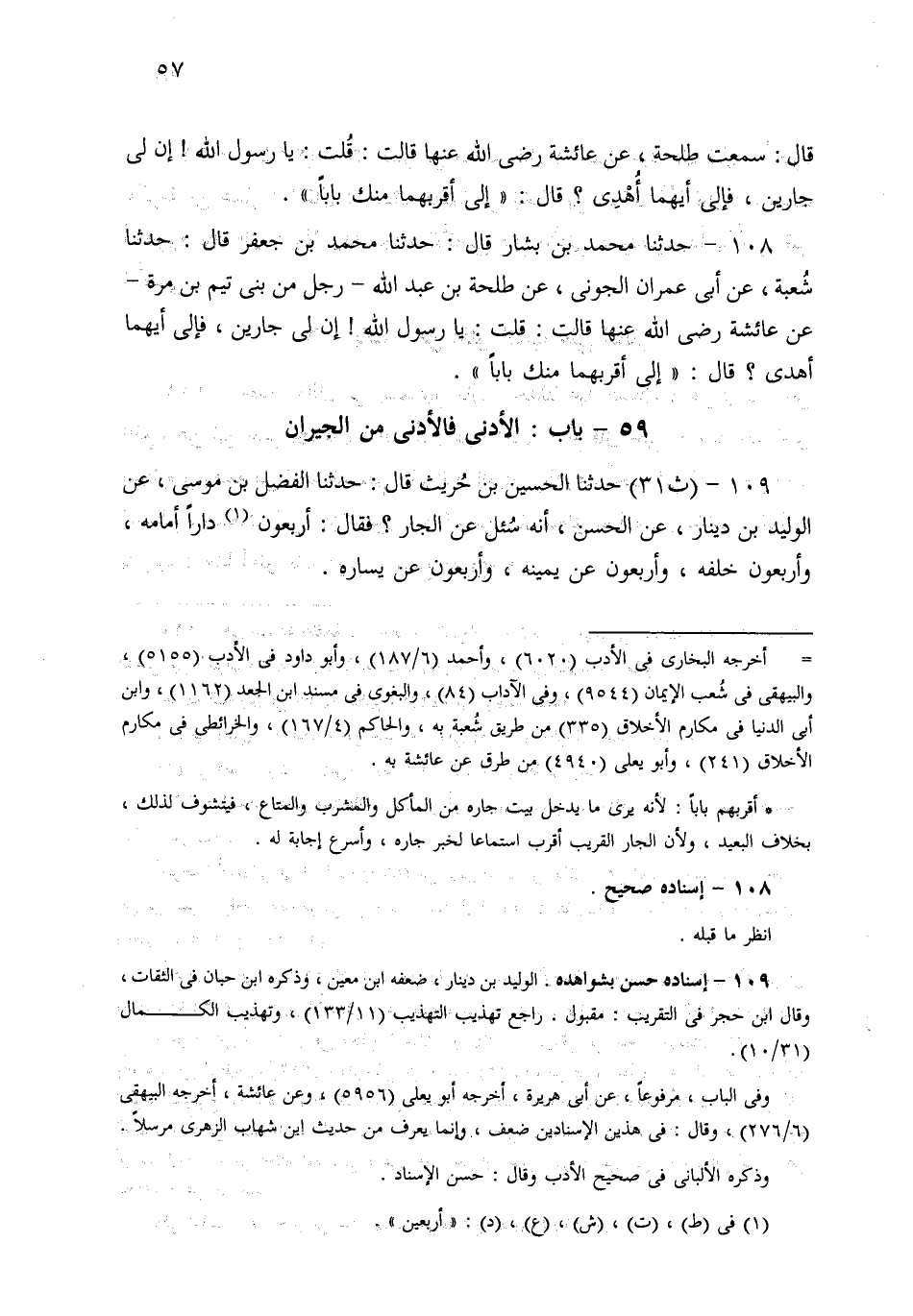 108- حَدثنا مُحَمَّدُ بْنُ بَشَّارٍ، قَالَ: حَدثنا مُحَمَّدُ بْنُ جَعْفَرٍ، قَالَ: حَدثنا شُعْبَةُ، عَنْ أَبِي عِمْرَانَ الْجَوْنِيِّ، عَنْ طَلْحَةَ بْنِ عَبْدِ اللهِ، رَجُلٌ مِنْ بَنِي تَيْمِ بْنِ مُرَّةَ، عَنْ عَائِشَةَ رَضِيَ اللهُ عَنْهَا قَالَتْ: قُلْتُ: يَا رَسُولَ اللهِ، إِنَّ لِي جَارَيْنِ، فَإِلَى أَيِّهِمَا أُهْدِي؟ قَالَ: إِلَى أَقْرَبِهِمَا مِنْكِ بَابًا.