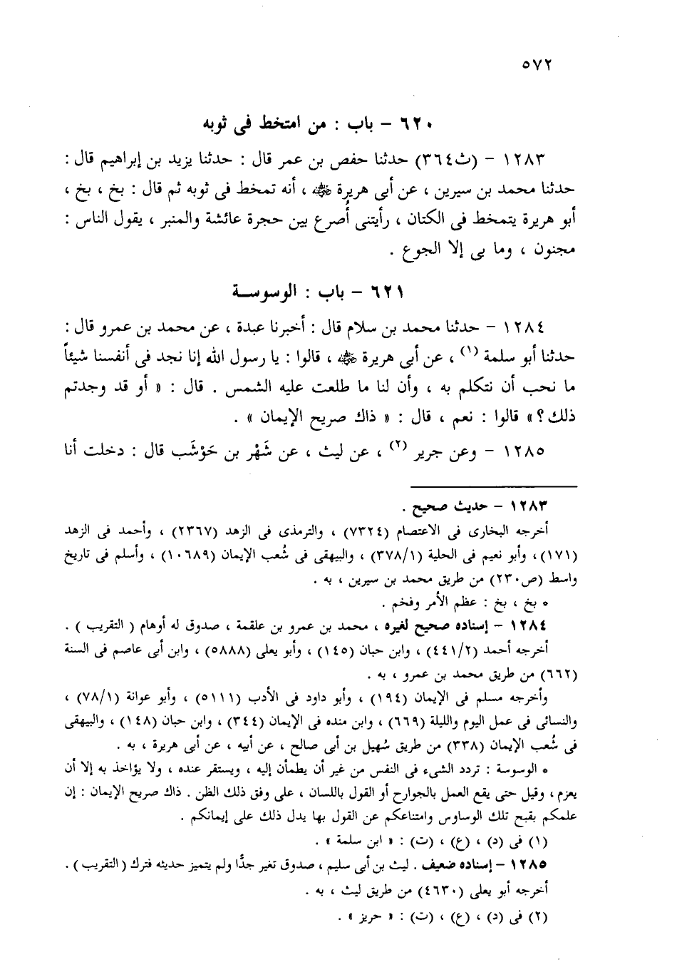 1284- حَدثنا مُحَمَّدُ بْنُ سَلاَمٍ، قَالَ: أَخْبَرَنَا عَبْدَةُ، عَنْ مُحَمَّدِ بْنِ عَمْرٍو، قَالَ: حَدثنا أَبُو سَلَمَةَ، عَنْ أَبِي هُرَيْرَةَ: قَالُوا: يَا رَسُولَ اللهِ، إِنَّا نَجِدُ فِي أَنْفُسِنَا شَيْئًا مَا نُحِبُّ أَنْ نَتَكَلَّمَ بِهِ وَإِنَّ لَنَا مَا طَلَعَتْ عَلَيْهِ الشَّمْسُ، قَالَ: أَوَ قَدْ وَجَدْتُمْ ذَلِكَ؟ قَالُوا: نَعَمْ، قَالَ: ذَاكَ صَرِيحُ الإيمَانِ.