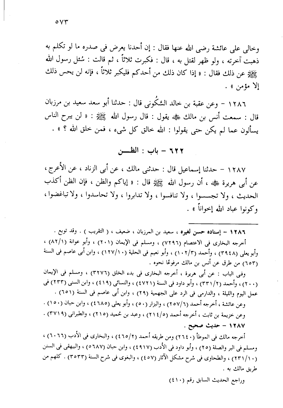 1287 - حَدثنا إِسْمَاعِيلُ قَالَ: حَدَّثَنِي مَالِكٌ، عَنْ أَبِي الزِّنَادِ، عَنِ الأَعْرَجِ، عَنْ أَبِي هُرَيْرَةَ، أَنَّ رَسُولَ اللهِ صَلى الله عَلَيهِ وسَلم قَالَ: إِيَّاكُمْ وَ الظَّنَّ، فَإِنَّ الظَّنَّ أَكْذَبُ الْحَدِيثِ، وَلاَ تَجَسَّسُوا، وَلاَ تَنَافَسُوا، وَلاَ تَدَابَرُوا، وَلاَ تَحَاسَدُوا، وَلاَ تَبَاغَضُوا، وَكُونُوا عِبَادَ اللهِ إِخْوَانًا.