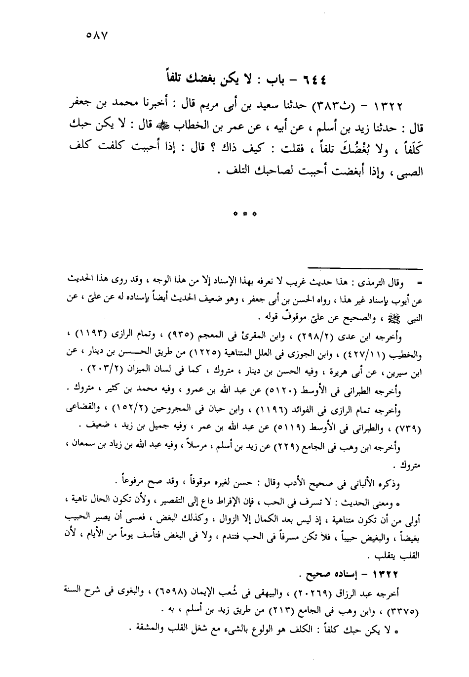 1322 - حَدثنا سَعِيدُ بْنُ أَبِي مَرْيَمَ، قَالَ: أَخْبَرَنَا مُحَمَّدُ بْنُ جَعْفَرٍ، قَالَ: حَدثنا زَيْدُ بْنُ أَسْلَمَ، عَنْ أَبِيهِ، عَنْ عُمَرَ بْنِ الْخَطَّابِ قَالَ: لاَ يَكُنْ حُبُّكَ كَلَفًا، وَلاَ بُغْضُكَ تَلَفًا، فَقُلْتُ: كَيْفَ ذَاكَ؟ قَالَ: إِذَا أَحْبَبْتَ كَلِفْتَ كَلَفَ الصَّبِيِّ، وَإِذَا أَبْغَضْتَ أَحْبَبْتَ لِصَاحِبِكَ التَّلَف.