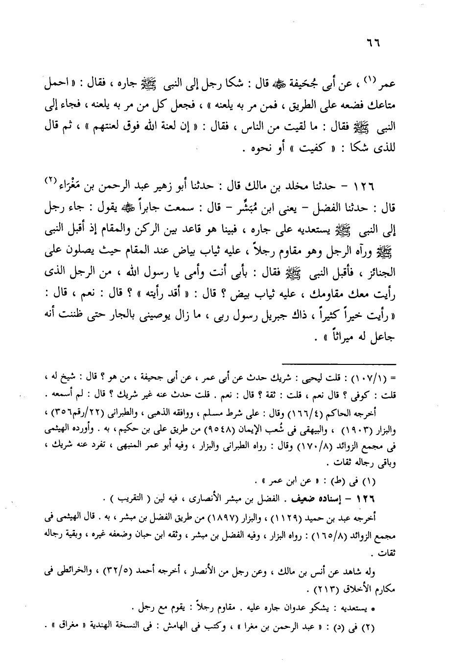 126- حَدثنا مَخْلَدُ بْنُ مَالِكٍ، قَالَ: حَدثنا أَبُو زُهَيْرٍ عَبْدُ الرَّحْمَنِ بْنُ مَغْرَاءَ، قَالَ: حَدثنا الْفَضْلُ يَعْنِي ابْنَ مُبَشِّرٍ قَالَ: سَمِعْتُ جَابِرًا يَقُولُ: جَاءَ رَجُلٌ إِلَى النَّبِيِّ صَلى الله عَلَيهِ وسَلم يَسْتَعْدِيهِ عَلَى جَارِهِ، فَبَيْنَا هُوَ قَاعِدٌ بَيْنَ الرُّكْنِ وَالْمَقَامِ إِذْ أَقْبَلَ النَّبِيُّ صَلى الله عَلَيهِ وسَلم وَرَآهُ الرَّجُلُ وَهُوَ مُقَاوِمٌ رَجُلاً عَلَيْهِ ثِيَابٌ بَيَاضٌ عِنْدَ الْمَقَامِ حَيْثُ يُصَلُّونَ عَلَى الْجَنَائِزِ، فَأَقْبَلَ النَّبِيُّ صَلى الله عَلَيهِ وسَلم فَقَالَ: بِأَبِي أَنْتَ وَأُمِّي يَا رَسُولَ اللهِ، مَنِ الرَّجُلُ الَّذِي رَأَيْتُ مَعَكَ مُقَاوِمَكَ عَلَيْهِ ثِيَابٌ بِيضٌ؟ قَالَ: أَقَدْ رَأَيْتَهُ؟ قَالَ: نَعَمْ، قَالَ: رَأَيْتَ خَيْرًا كَثِيرًا، ذَاكَ جِبْرِيلُ صَلى الله عَلَيهِ وسَلم رَسُولُ رَبِّي، مَا زَالَ يُوصِينِي بِالْجَارِ حَتَّى ظَنَنْتُ أَنَّهُ جَاعِلٌ لَهُ مِيرَاثًا.