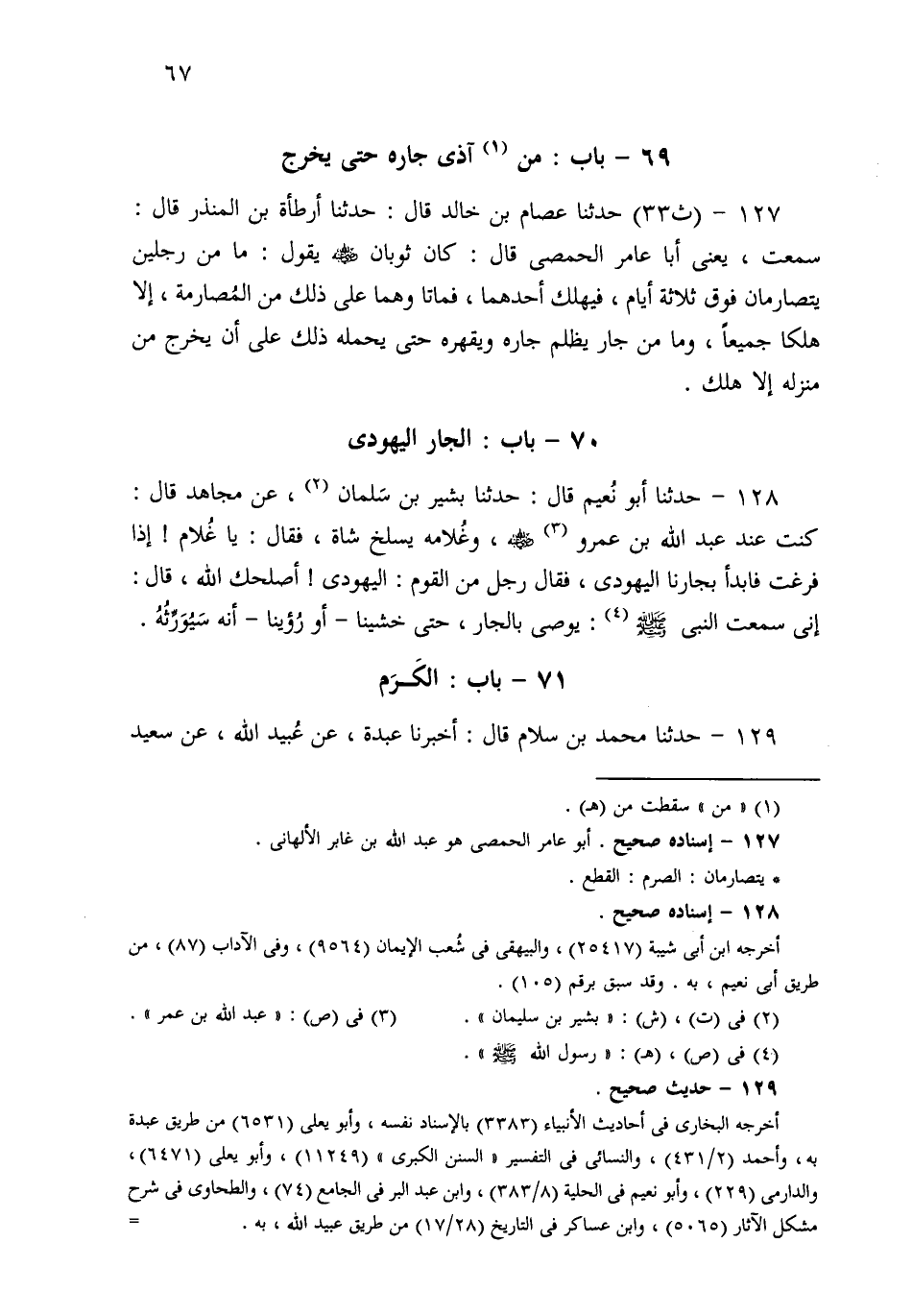 128- حَدثنا أَبُو نُعَيْمٍ، قَالَ: حَدثنا بَشِيرُ بْنُ سَلْمَانَ، عَنْ مُجَاهِدٍ قَالَ: كُنْتُ عِنْدَ عَبْدِ اللهِ بْنِ عَمْرٍو، وَغُلاَمُهُ يَسْلُخُ شَاةً، فَقَالَ: يَا غُلاَمُ، إِذَا فَرَغْتَ فَابْدَأْ بِجَارِنَا الْيَهُودِيِّ، فَقَالَ رَجُلٌ مِنَ الْقَوْمِ: الْيَهُودِيُّ أَصْلَحَكَ اللَّهُ؟ قَالَ: إِنِّي سَمِعْتُ النَّبِيَّ صَلى الله عَلَيهِ وسَلم يُوصِي بِالْجَارِ، حَتَّى خَشِينَا، أَوْ رُئِينَا، أَنَّهُ سَيُوَرِّثُهُ.