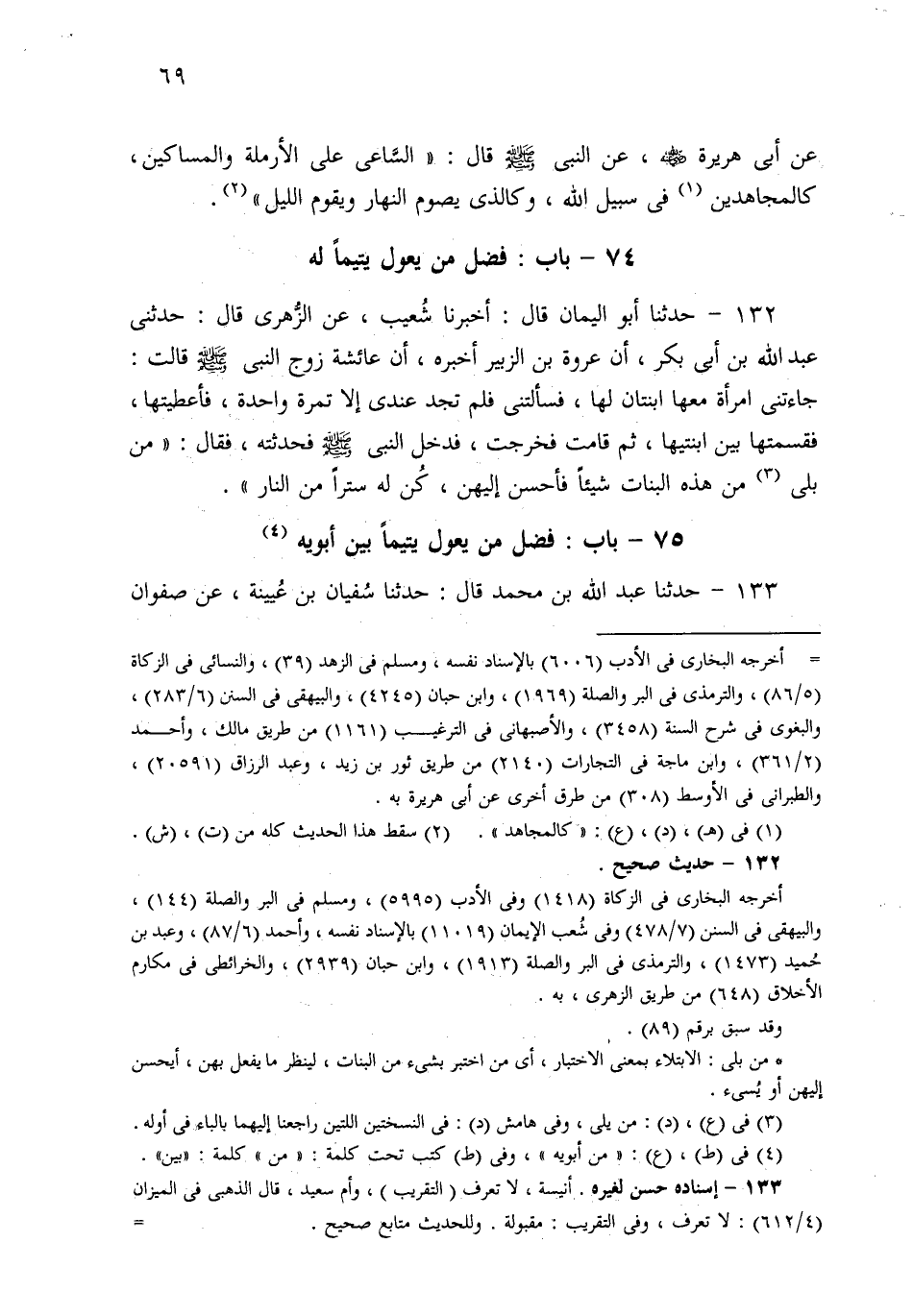 133- حَدثنا عَبْدُ اللهِ بْنُ مُحَمَّدٍ، قَالَ: حَدثنا سُفْيَانُ بْنُ عُيَيْنَةَ، عَنْ صَفْوَانَ قَالَ: حَدَّثَتْنِي أُنَيْسَةُ، عَنْ أُمِّ سَعِيدٍ بِنْتِ مُرَّةَ الْفِهْرِيِّ، عَنْ أَبِيهَا، عَنِ النَّبِيِّ صَلى الله عَلَيهِ وسَلم: أَنَا وَكَافِلُ الْيَتِيمِ فِي الْجَنَّةِ كَهَاتَيْنِ، أَوْ كَهَذِهِ مِنْ هَذِهِ، شَكَّ سُفْيَانُ فِي الْوُسْطَى وَالَّتِي تَلِي الإِبْهَامَ.
