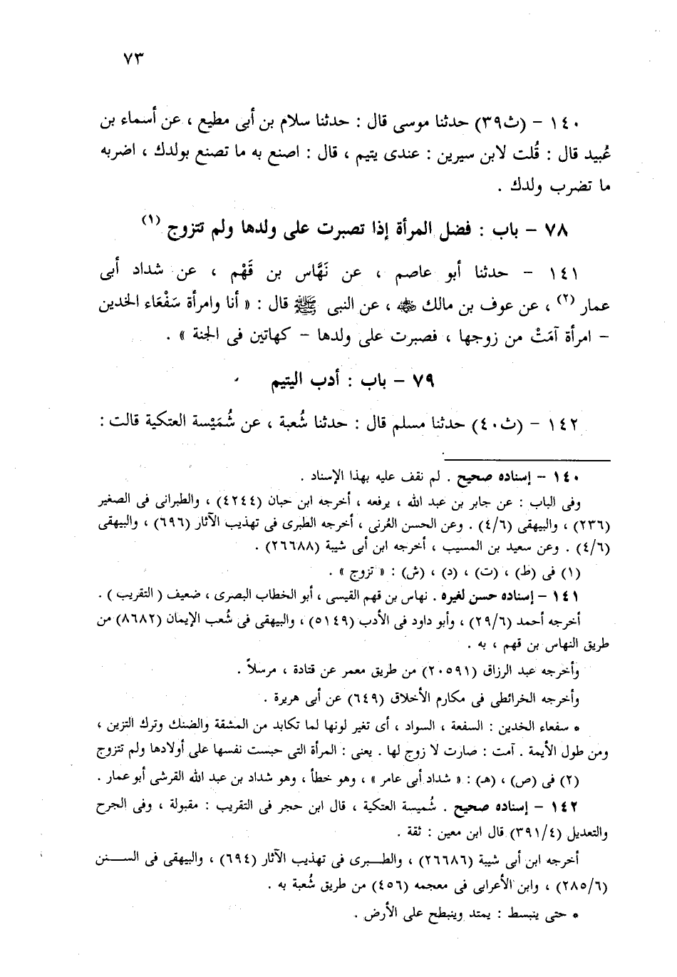 141- حَدثنا أَبُو عَاصِمٍ، عَنْ نَهَّاسِ بْنِ قَهْمٍ، عَنْ شَدَّادٍ أَبِي عَمَّارٍ، عَنْ عَوْفِ بْنِ مَالِكٍ، عَنِ النَّبِيِّ صَلى الله عَلَيهِ وسَلم قَالَ: أَنَا وَامْرَأَةٌ سَفْعَاءُ الْخَدَّيْنِ، امْرَأَةٌ آمَتْ مِنْ زَوْجِهَا فَصَبَرْتَ عَلَى وَلَدِهَا، كَهَاتَيْنِ فِي الْجَنَّةِ.