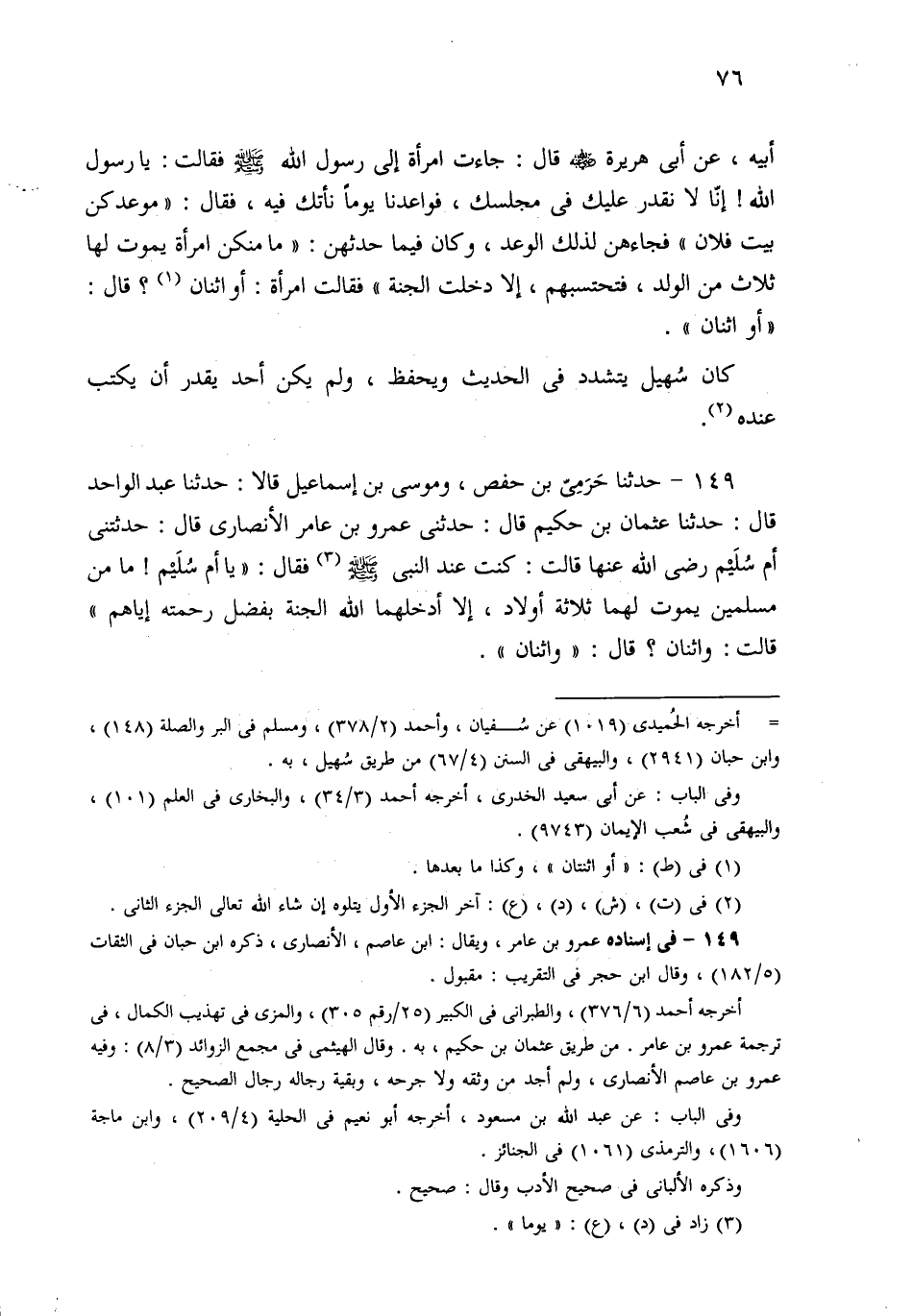 149- حَدثنا حَرَمِيُّ بْنُ حَفْصٍ، وَمُوسَى بْنُ إِسْمَاعِيلَ، قَالاَ: حَدثنا عَبْدُ الْوَاحِدِ، قَالَ: حَدثنا عُثْمَانُ بْنُ حَكِيمٍ قَالَ: حَدَّثَنِي عَمْرُو بْنُ عَامِرٍ الأَنْصَارِيُّ قَالَ: حَدَّثَتْنِي أُمُّ سُلَيْمٍ قَالَتْ: كُنْتُ عِنْدَ النَّبِيِّ صَلى الله عَلَيهِ وسَلم فَقَالَ: يَا أُمَّ سُلَيْمٍ مَا مِنْ مُسْلِمَيْنِ يَمُوتُ لَهُمَا ثَلاَثَةُ أَوْلاَدٍ، إِلاَّ أَدْخَلَهُمَا اللهُ الْجَنَّةَ بِفَضْلِ رَحْمَتِهِ إِيَّاهُمْ، قُلْتُ: وَاثْنَانِ؟ قَالَ: وَاثْنَانِ.