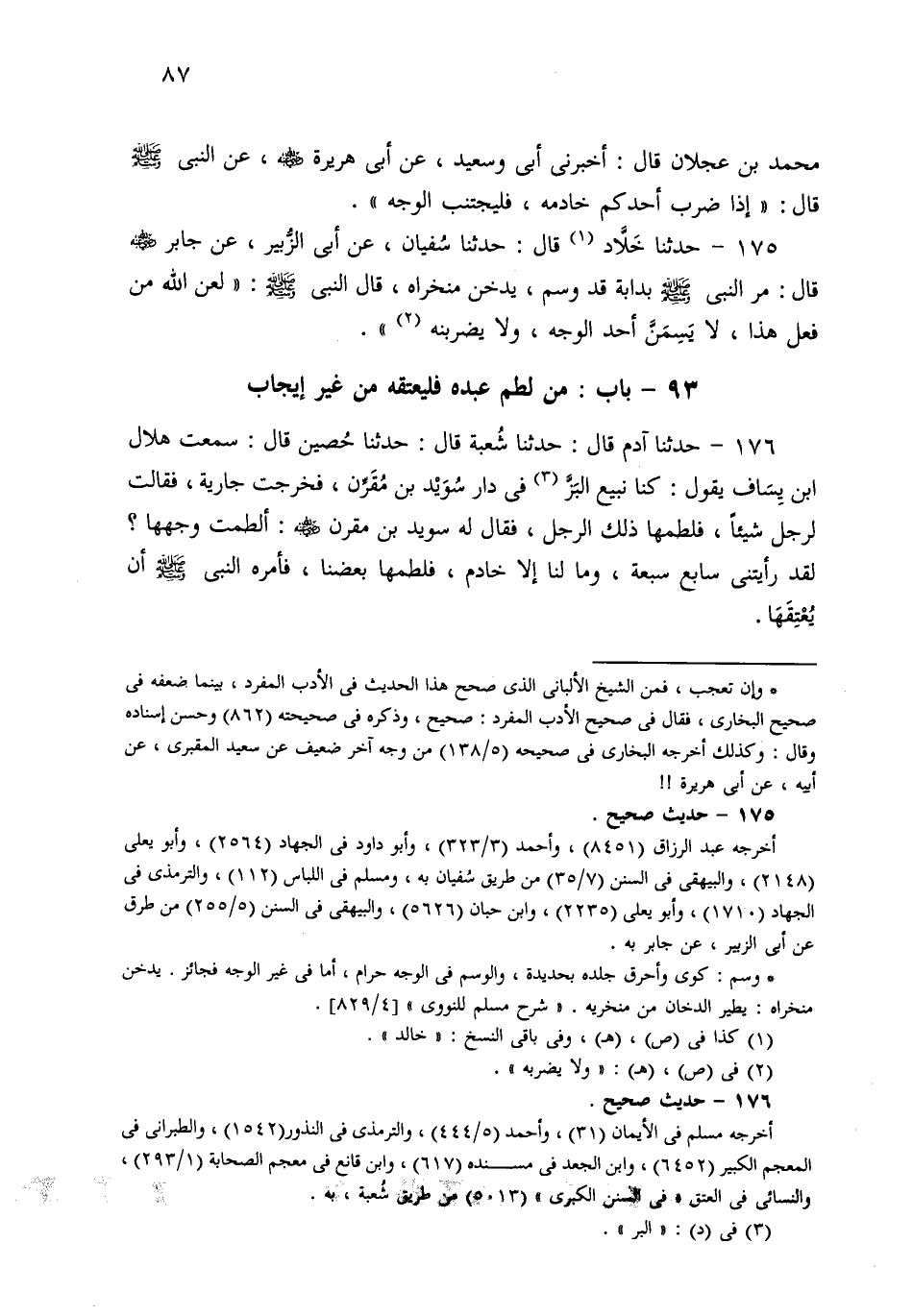 175- حَدثنا خَالِدٌ، قَالَ: حَدثنا سُفْيَانُ، عَنْ أَبِي الزُّبَيْرِ، عَنْ جَابِرٍ قَالَ: مَرَّ النَّبِيُّ صَلى الله عَلَيهِ وسَلم بِدَابَّةٍ قَدْ وُسِمَ يُدَخِّنُ مَنْخِرَاهُ، قَالَ النَّبِيُّ صَلى الله عَلَيهِ وسَلم: لَعَنَ اللهُ مَنْ فَعَلَ هَذَا، لاَ يَسِمَنَّ أَحَدٌ الْوَجْهَ وَلاَ يَضْرِبَنَّهُ.