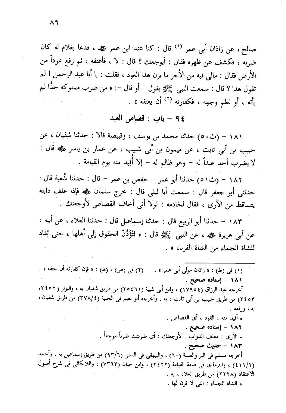 182- حَدثنا أَبُو عُمَرَ حَفْصُ بْنُ عُمَرَ، قَالَ: حَدثنا شُعْبَةُ قَالَ: حَدَّثَنِي أَبُو جَعْفَرٍ قَالَ: سَمِعْتُ أَبَا لَيْلَى قَالَ: خَرَجَ سَلْمَانُ فَإِذَا عَلَفُ دَابَّتِهِ يَتَسَاقَطُ مِنَ الآرِيِّ، فَقَالَ لِخَادِمِهِ: لَوْلاَ أَنِّي أَخَافُ الْقِصَاصَ لَأَوْجَعْتُكَ.