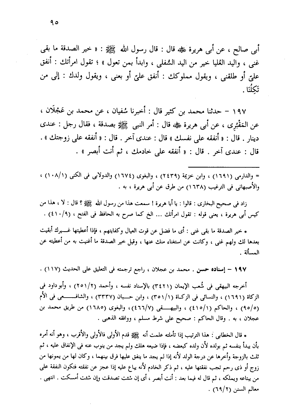 197- حَدثنا مُحَمَّدُ بْنُ كَثِيرٍ، قَالَ: أَخْبَرَنَا سُفْيَانُ، عَنْ مُحَمَّدِ بْنِ عَجْلاَنَ، عَنِ الْمَقْبُرِيِّ، عَنْ أَبِي هُرَيْرَةَ قَالَ: أَمَرَ النَّبِيُّ صَلى الله عَلَيهِ وسَلم بِصَدَقَةٍ، فَقَالَ رَجُلٌ: عِنْدِي دِينَارٌ، قَالَ: أَنْفِقْهُ عَلَى نَفْسِكَ، قَالَ: عِنْدِي آخَرُ، قَالَ: أَنْفِقْهُ عَلَى زَوْجَتِكَ قَالَ: عِنْدِي آخَرُ، قَالَ: أَنْفِقْهُ عَلَى خَادِمِكَ، ثُمَّ أَنْتَ أَبْصَرُ.