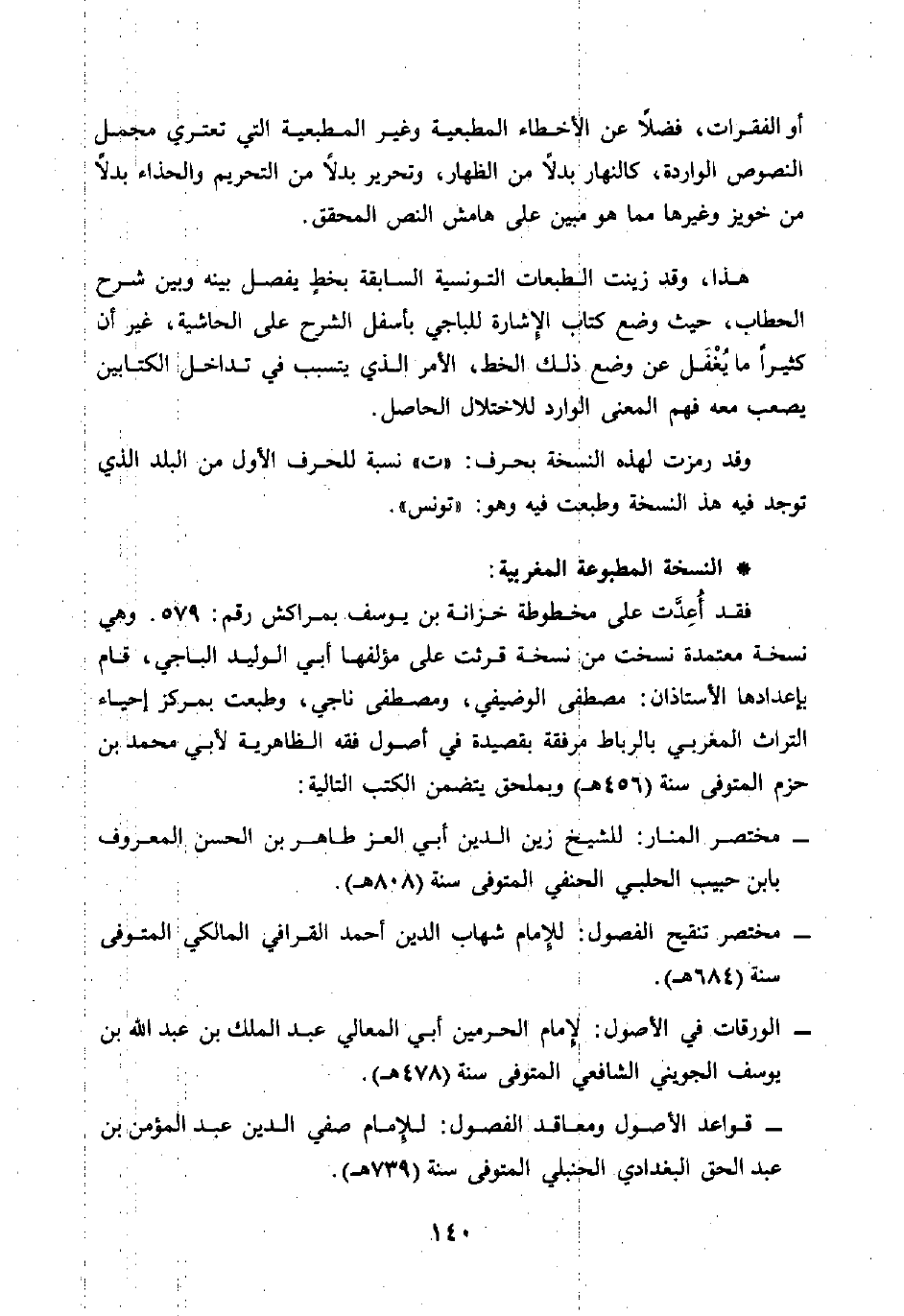 هذا، وقد زينت الطبعات التونسية السابقة بخطٍ يفصل بينه وبين شرح الحطاب، حيث وضع كتاب الإشارة للباجي بأسفل الشرح على الحاشية، غير أن كثيرًا ما يُغْفَل عن وضع ذلك الخط، الأمر الذي يتسبب في تداخل الكتابين يصعب معه فهم المعنى الوارد للاختلال الحاصل.