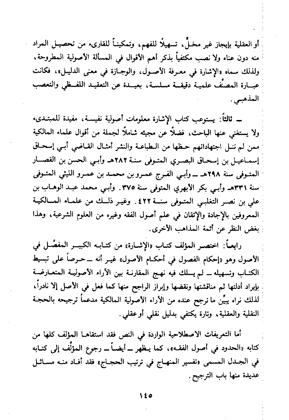 - ثالثًا: يستوعب كتاب الإشارة معلومات أصولية نفيسة، مفيدة للمبتدئ ولا يستغني عنها الباحث، فضلًا عن مجيئه شاملًا لجملة من أقوال علماء المالكية ممن لم تنل اجتهاداتهم حظها من الطباعة والنشر أمثال القاضي أبي إسحاق إسماعيل بن إسحاق البصري المتوفى سنة ٢٨٢ هـ وأبي الحسن بن القصار المتوفى سنة ٢٩٨ هـ - وأبي الفرج عمرو بن محمد بن عمرو الليثي المتوفى سنة ٣٣١ هـ وأبي بكر الأبهري المتوفى سنة ٣٧٥. وأبي محمد عبد الوهاب بن علي بن نصر التغلبي المتوفى سنة ٤٢٢. وغير ذلك من علماء المالكية المعروفين بالإجادة والإتقان في علم أصول الفقه وغيره من العلوم الشرعية، وهذا بغض النظر عن أئمة المذاهب الأخرى.