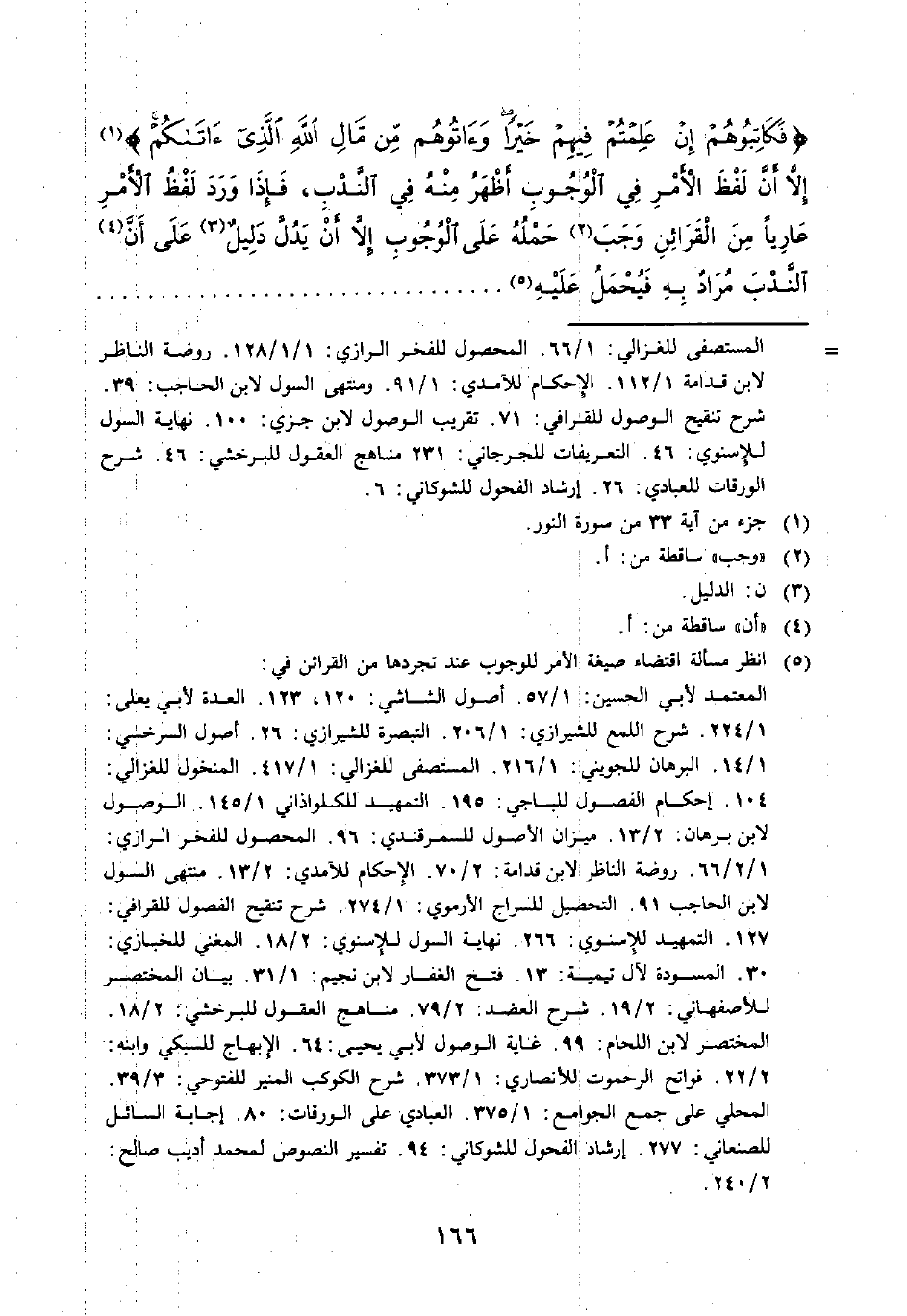 {فَكَاتِبُوهُمْ إِنْ عَلِمْتُمْ فيهِمْ خَيْرًا وَآتُوهُمْ مِنْ مَالِ اللَّهِ الَّذِي آتَاكُمْ} (١) إِلَّا أَنَّ لَفْظَ الْأَمْرِ في الْوُجُوبِ أَظْهَرُ مِنْهُ في النَّدْبِ، فَإِذَا وَرَدَ لَفْظُ الْأَمْرِ عَارِيًا مِنَ الْقَرَائِنِ وَجَبَ (٢) حَمْلُهُ عَلَى الْوُجُوبِ إِلَّا أَنْ يَدُلَّ دَلِيلٌ (٣) عَلَى أَنَّ (٤) النَّدْبَ مُرَادٌ بِهِ فَيُحْمَلُ عَلَيْهِ (٥) ...........................