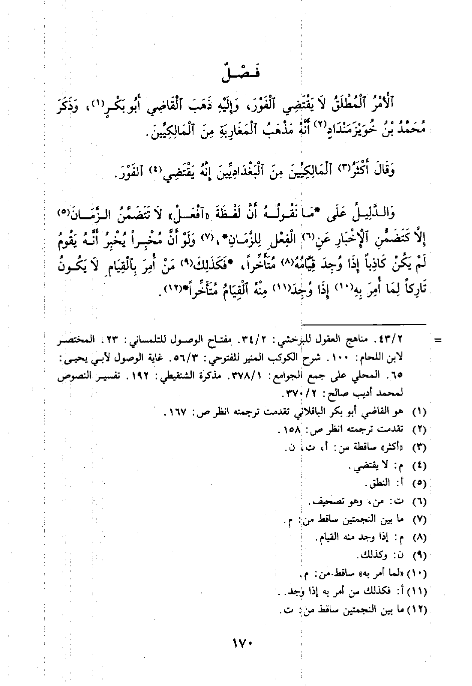 وَقَالَ أَكْثَرُ (٣) الْمَالِكِيِّينَ مِنَ الْبَغْدَادِيِّينَ إِنَّهُ يَقْتَضِي (٤) الْفَوْرَ.