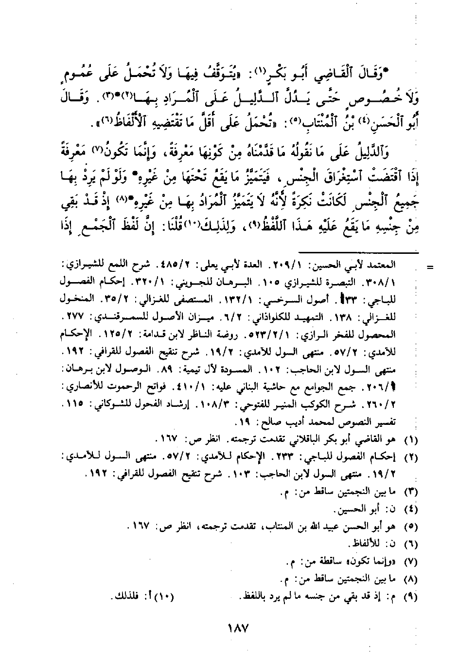 * وَقَالَ الْقَاضِي أَبُو بَكْرٍ (١): (يُتَوَقَّفُ فيهَا وَلَا تُحْمَلُ عَلَى عُمُومٍ وَلَا خُصُوصٍ حَتَّى يَدُلَّ الدَّلِيلُ عَلَى الْمُرَادِ بِهَا (٢) * (٣). وَقَالَ أَبُو الْحَسَنِ (٤) بْنُ الْمُنْتَابِ (٥): (تُحْمَلُ عَلَى أَقَلَّ مَا تَقْتَضِيهِ الْأَلْفَاظُ) (٦).