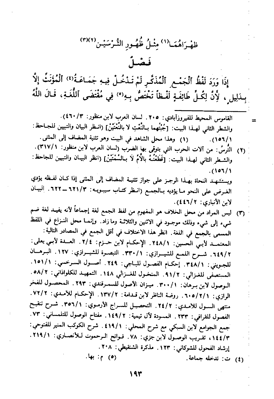 (٣) ليس المراد من محل الخلاف هو المفهوم من لفظ الجمع لغة إجماعًا لأنه يفيد لغة ضم شيء إلى شيء وذلك موجود في الاثنين والثلاثة وما زاد. وإنما محل النزاع في اللفظ المسمى بالجمع في اللغة. انظر هذا الاختلاف في أقل الجمع في المصادر التالية: