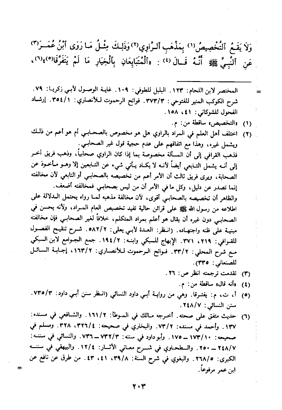 وَلَا يَقَعُ التَّخْصِيصُ (١) بِمَذْهَبِ الرَّاوِي (٢) وَذَلِكَ مِثْلُ مَا رَوَى ابْنُ عُمَرَ (٣) عَنِ النَّبِيِّ - صَلَّى اللَّهُ عَلَيْهِ وَسَلَّمَ - أَنَّهُ قَالَ (٤): (الْمُتَبَايِعَانِ بِالْخِيَارِ مَا لَمْ يَتَفَرَّقَا (٥)) (٦)،