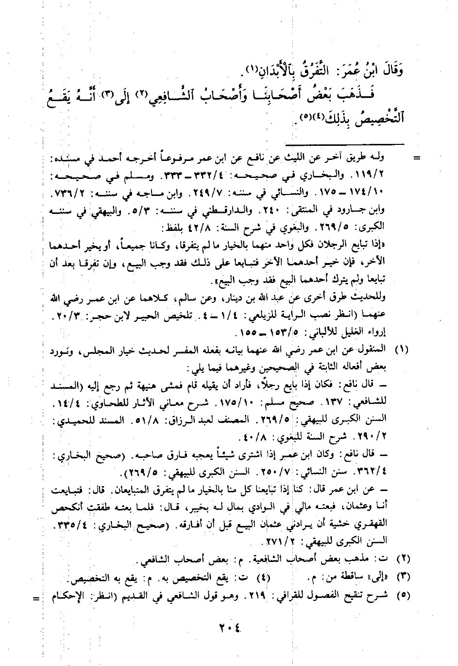 - عن ابن عمر قال: كنا إذا تبايعنا كل منا بالخيار ما لم يتفرق المتبايعان. قال: فتبايعت أنا وعثمان، فبعته مالي في الوادي بمال له خيبر، قال: فلما بعته طفقت أنكحص القهقري خشية أن يرادني عثمان البيع قبل أن أفارقه. (صحيح البخاري: ٤/ ٣٣٥. السنن الكبرى للبيهقي: ٢/ ٢٧١.