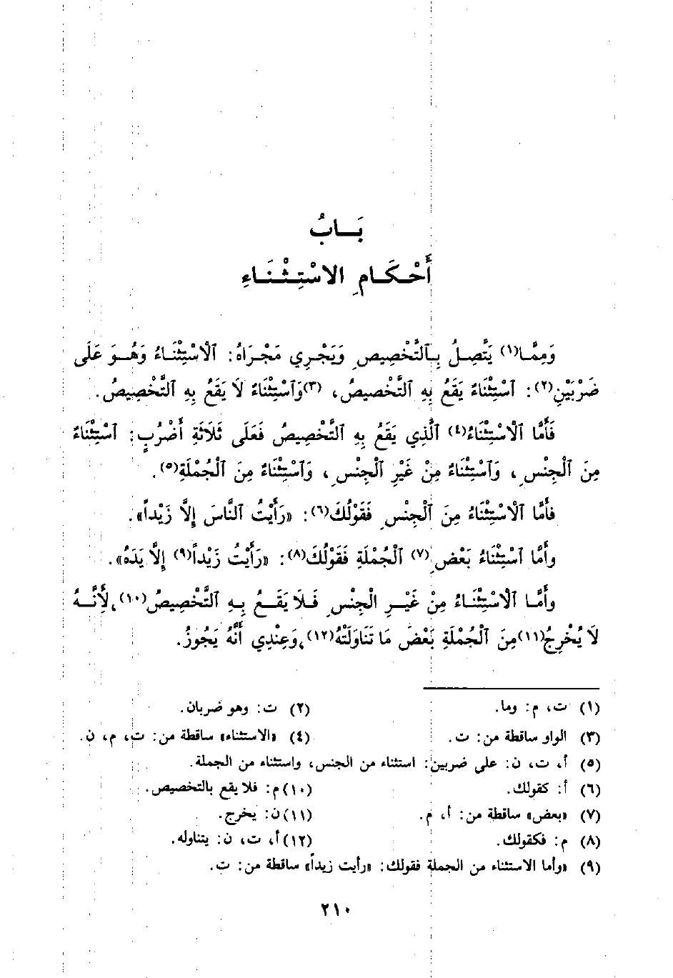 فَأَمَّا الاسْتِثْنَاءُ (٤) الَّذِي يَقَعُ بِهِ التَّخْصِيصُ فَعَلَى ثَلَاثَةِ أَضْرُبٍ: اسْتِثْنَاءٌ مِنَ الْجِنْسِ، واسْتِثْنَاءٌ مِنَ غَيْرِ الْجِنْسِ، وَاسْتِثْنَاءٌ مِنَ الْجُمْلَةِ (٥).