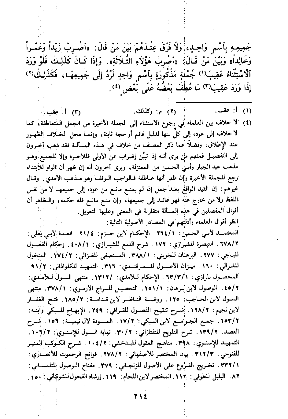 (٤) لا خلاف بين العلماء في رجوع الاستثناء إلى الجملة الأخيرة من الجمل المتعاطفة، كما لا خلاف إلى عوده إلى كلِّ منها لدليل قائم أو حجة ثابتة، وإنما محل الخلاف الظهور عند الإطلاق، وفضلًا. عما ذكر المصنف من خلاف في هذه المسألة فقد ذهب آخرون إلى التفصيل فمنهم من يرى أنه إذا تبيَّن إضراب عن الأولى فللآخرة وإلا للجميع وهو مذهب عبد الجبار وأبي الحسين من المعتزلة، ويرى آخرون أنه إن ظهر أن الواو للابتداء رجع للجملة الأخيرة وإن ظهر أنها عاطفة فالواجب الوقف وهو مذهب الآمدي. وقال غيرهم: إن القيد الواقع بعد جمل إذا لم يمنع مانع من عوده إلى جميعها لا من نفس اللفظ ولا من خارج عنه فهو عائد إلى جميعها، وإن منع مانع فله حكمه، والظاهر أن أقوال المفصلين في هذه الحالة متقاربة في المعنى وعليها التعويل.
