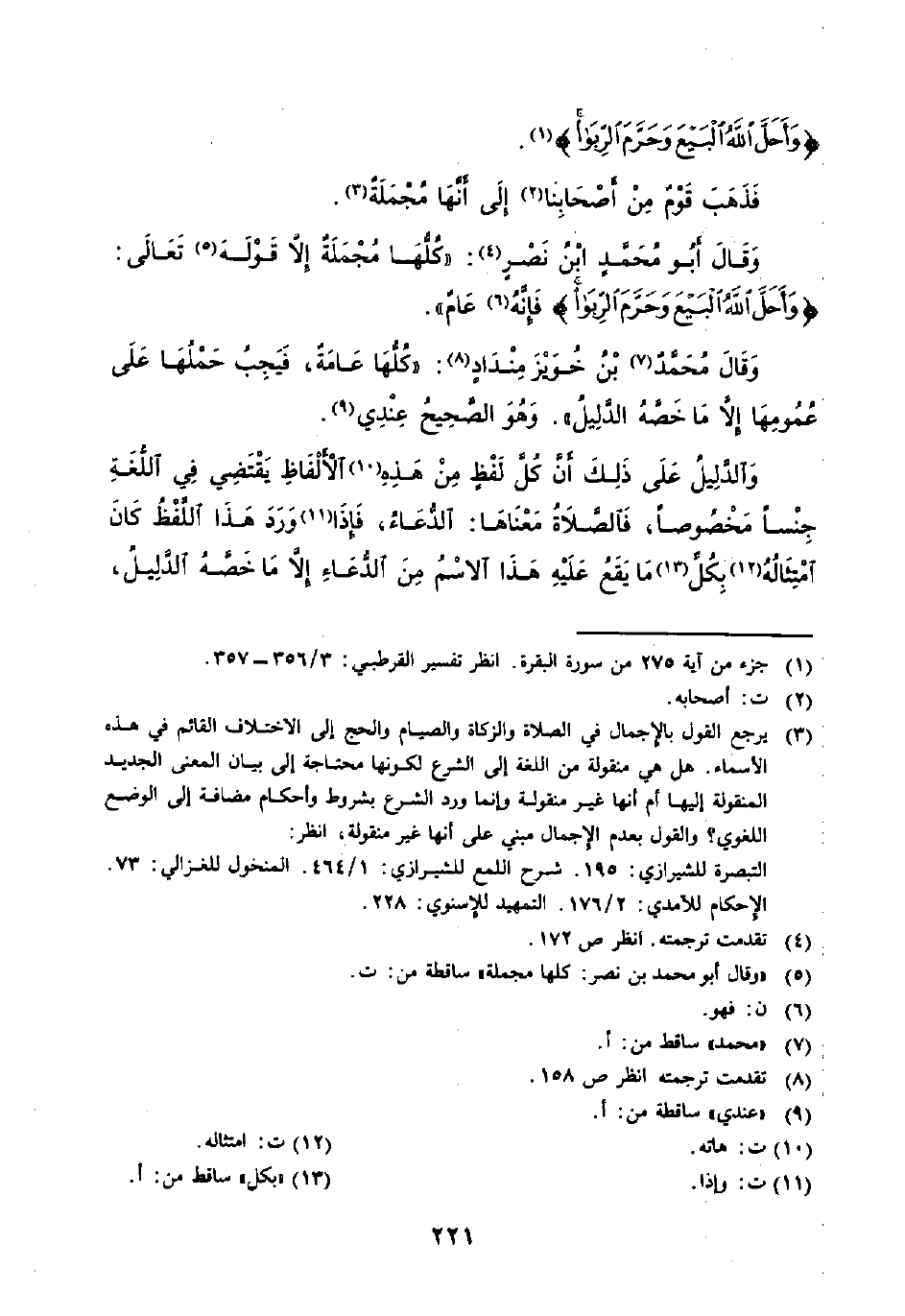 وَقَالَ أَبُو مُحَمَّدٍ ابْنُ نَصْرٍ (٤): (كُلُّهَا مُجْمَلَةٌ إِلَّا قَوْلُهُ (٥) تَعَالَى: {وَأَحَلَّ اللَّهُ الْبَيْعَ وَحَرَّمَ الرِّبَا}، فَإِنَّهُ (٦) عَامٌ).