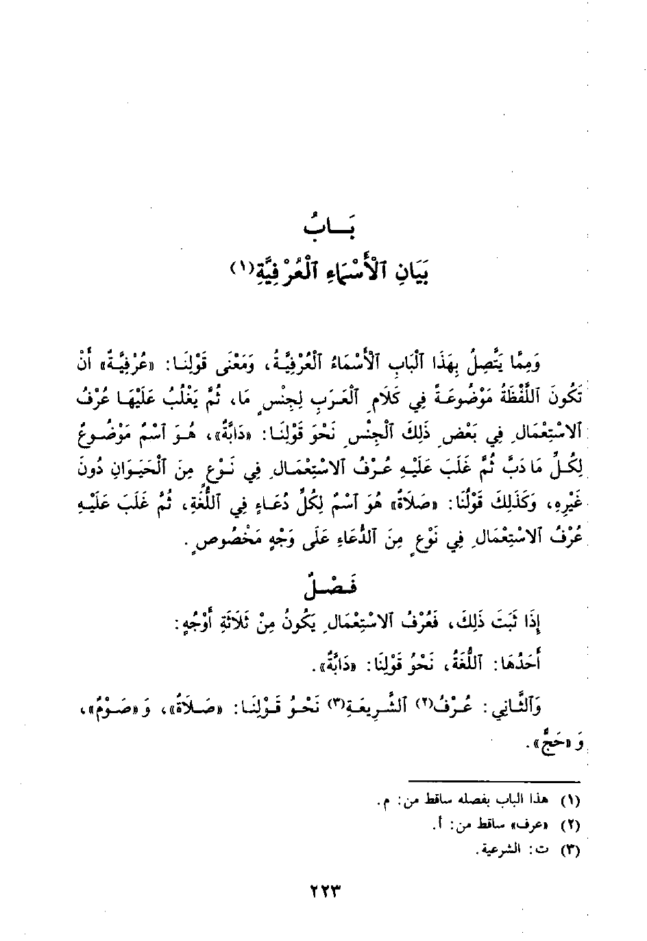 وَمِمَّا يَتَّصِلُ بِهَذَا الْبَابِ الْأَسْمَاءُ الْعُرْفيَّةُ، وَمَعْنَى قَوْلِنَا: (عُرْفيَّةٌ) أَنْ تَكُونَ اللَّفْظَةُ مَوْضُوعَةً في كَلَامِ الْعَرَبِ لِجِنْسٍ مَا، ثُمَّ يَغْلُبُ عَلَيْهَا عُرْفُ الاسْتِعْمَالِ في بَعْضِ ذَلِكَ الْجِنْسِ نَحْوَ قَوْلِنَا: (دَابَّةٌ)، هُوَ اسْمٌ مَوْضُوعٌ لِكُلِّ مَا دَبَّ ثُمَّ غَلَبَ عَلَيْهِ عُرْفُ الاسْتِعْمَالِ في نَوْعٍ مِنْ الْحَيَوَانِ دُونَ غَيْرِهِ، وَكَذَلِكَ قَوْلُنَا: (صَلَاةٌ) هُوَ اسْمٌ لِكُلِّ دُعَاءٍ في اللُّغَةِ، ثُمَّ غَلَبَ عَلَيْهِ عُرْفُ الاسْتِعْمَالِ في نُوعٍ مِنَ الدُّعَاءِ عَلَى وَجْهٍ مَخْصُوصٍ.