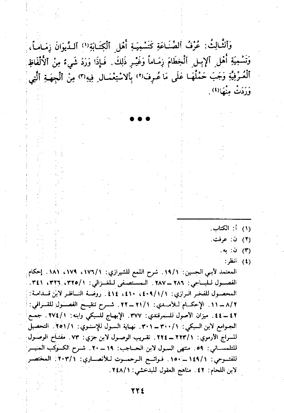 وَالثَّالِثُ: عُرْفُ الصِّنَاعَةِ كَتَسْمِيَةِ أَهْلِ الْكِتَابَةِ (١) الدِّيوَانَ زِمَامًا، وَتَسْمِيَةِ أَهْلِ الْإِبِلِ الْخِطَامَ زِمَامًا وَغَيْرِ ذَلِكَ. فَإِذَا وَرَدَ شَيْءٌ مِنْ الْأَلْفَاظِ الْعُرْفيَّةِ وَجَبَ حَمْلُهَا عَلَى مَا عُرِفَ (٢) بِالاسْتِعْمَالِ فيهِ (٣) مِنْ الْجِهَةِ الَّتِي وَرَدَتْ مِنْهَا (٤).